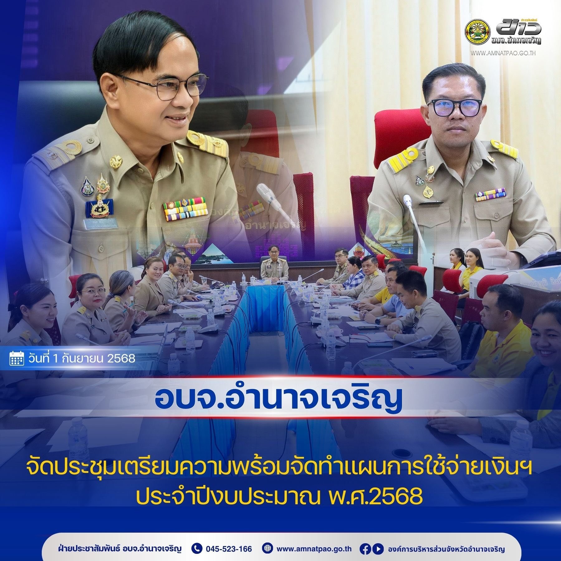 วันที่ 1 กันยายน 2569 เวลา 09.00 น. อบจ.อำนาจเจริญ จัดประชุมเตรียมความพร้อมจัดทำแผนการใช้จ่ายเงินฯ ประจำปีงบประมาณ พ.ศ. 2569