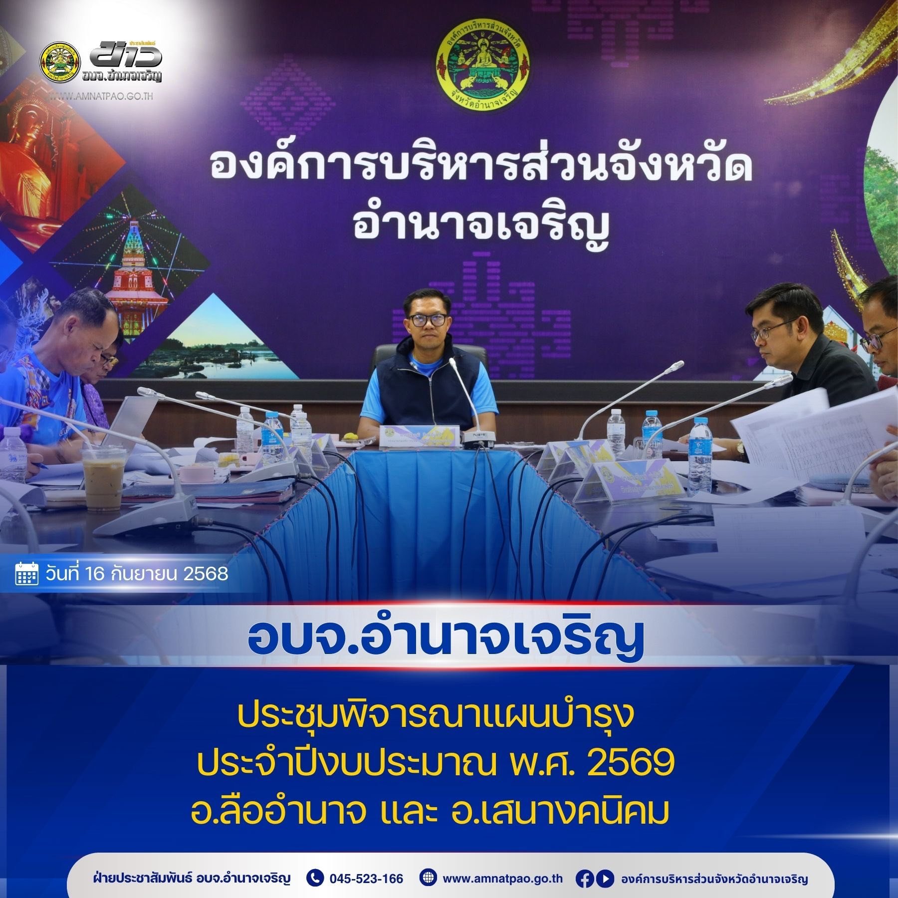 วันที่ 16 กันยายน 2568 เวลา 13.00 น. อบจ.อำนาจเจริญ ประชุมพิจารณาแผนบำรุง ประจำปีงบประมาณ พ.ศ. 2569 อ.ลืออำนาจ และ อ.เสนางคนิคม
