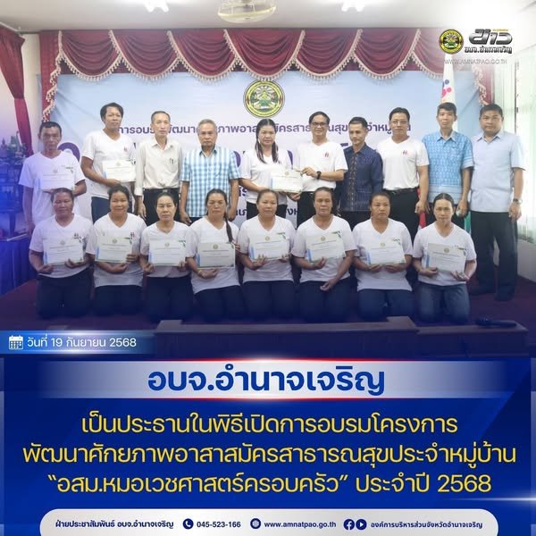 วันที่ 19 กันยายน 2568 เวลา 10.30 น. อบจ.อำนาจเจริญ เป็นประธานในพิธีเปิดการอบรมโครงการพัฒนาศักยภาพอาสาสมัครสาธารณสุขประจำหมู่บ้าน “อสม.หมอเวชศาสตร์ครอบครัว” ประจำปี 2568