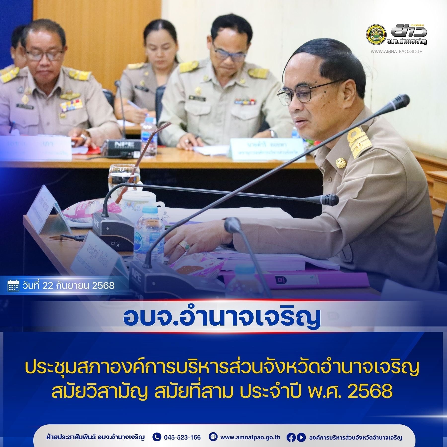 วันที่ 22 กันยายน 2568 เวลา 10.00 น. นายวิชัย แสวงสุข ประธานสภา อบจ.อำนาจเจริญ เปิดการประชุมสภา อบจ.อำนาจเจริญ สมัยวิสามัญ สมัยที่สาม ประจำปี พ.ศ. 2568 เพื่อพิจารณาวาระโอนงบประมาณสำหรับแก้ไขปัญหาความเดือดร้อนของประชาชนในพื้นที่จังหวัดอำนาจเจริญ