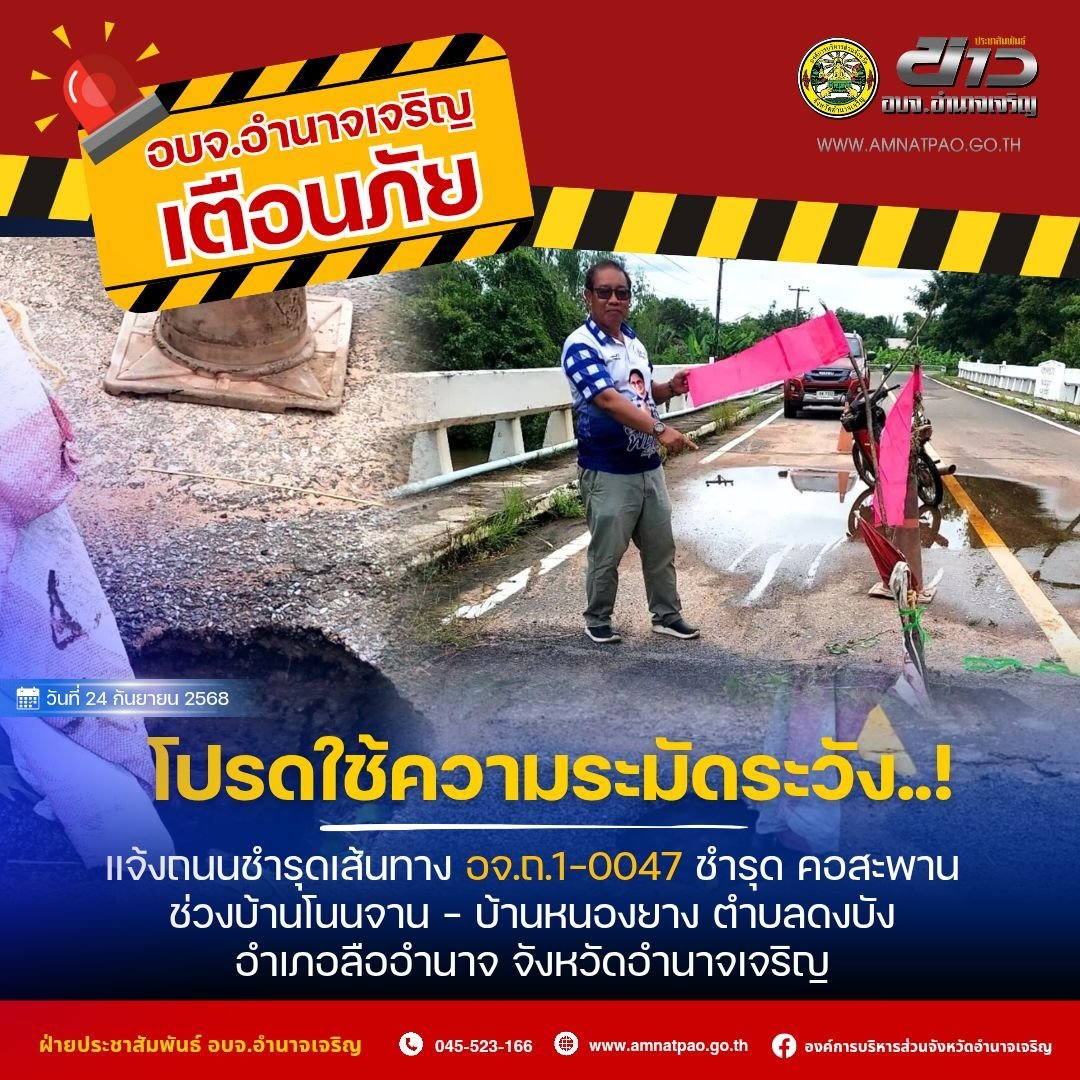 โปรดใช้ความระมัดระวัง อบจ.อำนาจเจริญ แจ้งถนนชำรุดเส้นทาง อจ.ถ.1-0047 ชำรุด คอสะพาน ช่วงบ้านโนนจาน- บ้านหนองยาง ตำบลดงบัง อำเภอลืออำนาจ จังหวัดอำนาจเจริญ นายพนัส พันธุ์วรรณ นายก อบจ.อำนาจเจริญ สั่งการให้ กองช่าง เร่งดำเนินการแก้ไข เพื่อให้สัญจรได้ตามปกติเร็วที่สุด