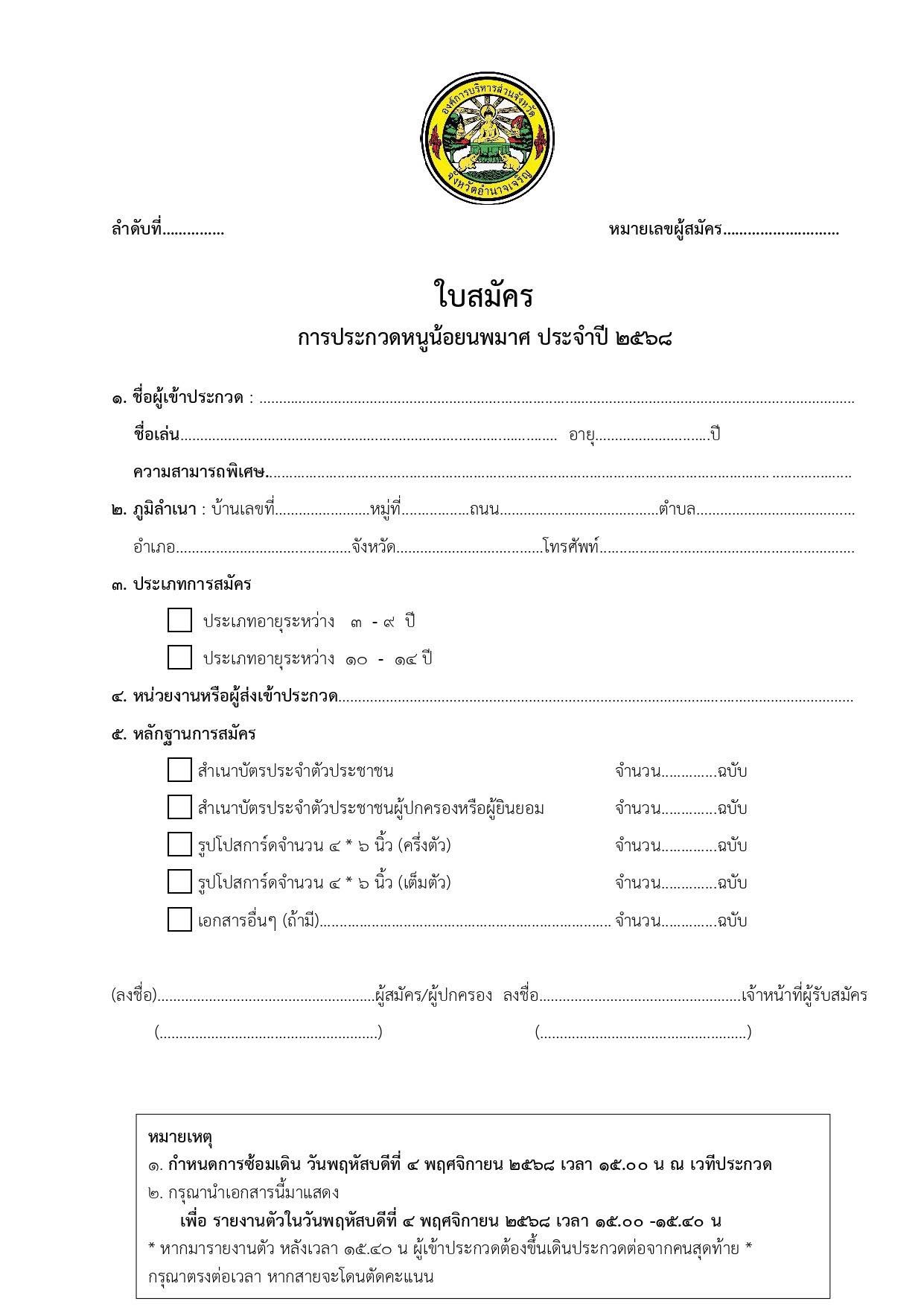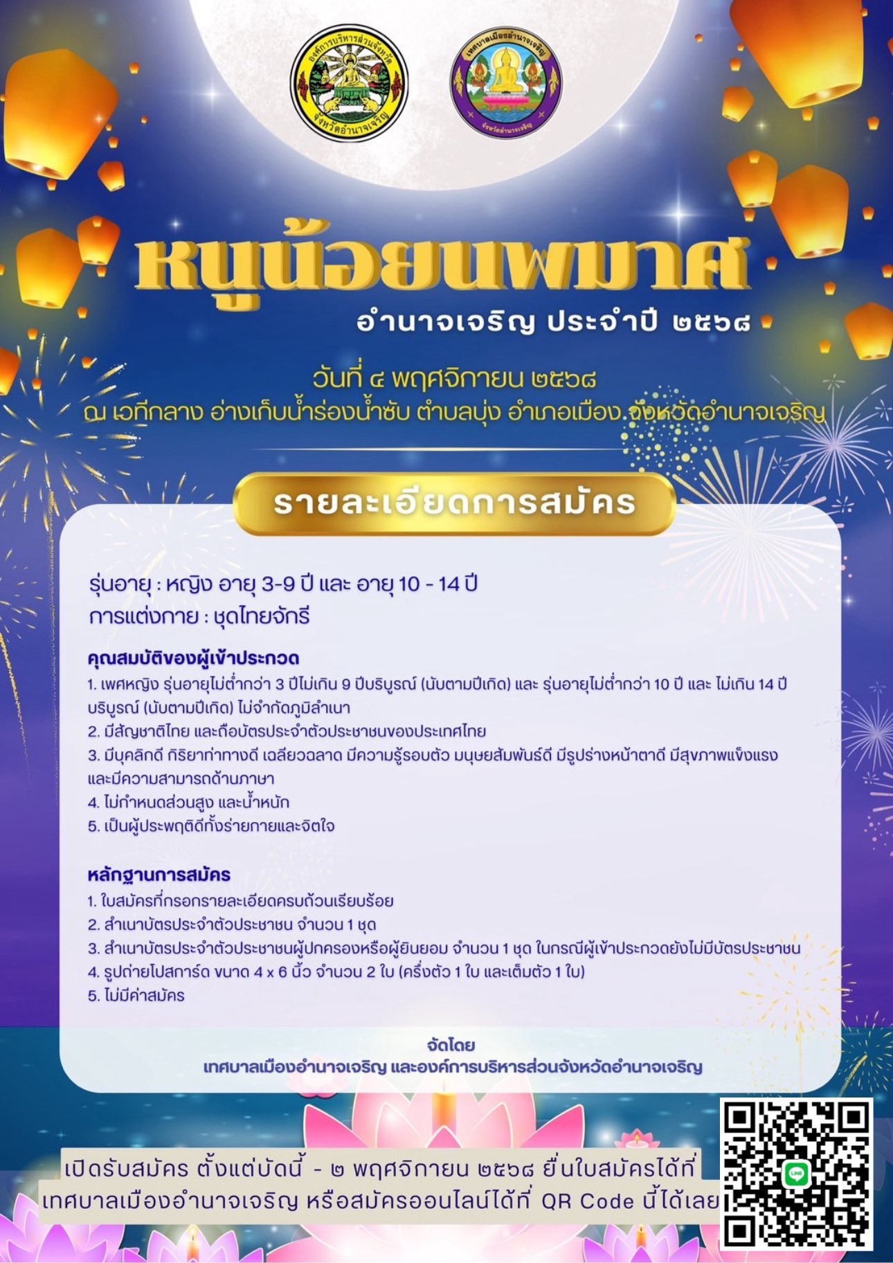 ขอเชิญน้องๆหนูๆ ผู้มีใจรักในงานประกวด อายุตั้งแต่ 3 ~ 14 ปี เข้าร่วมประกวด หนูน้อยนพมาศ อำนาจเจริญ ปี 2568