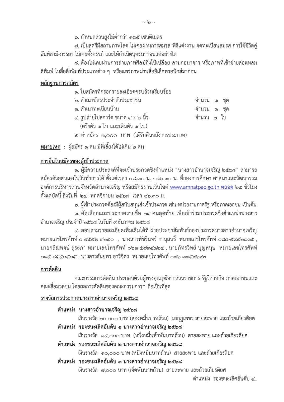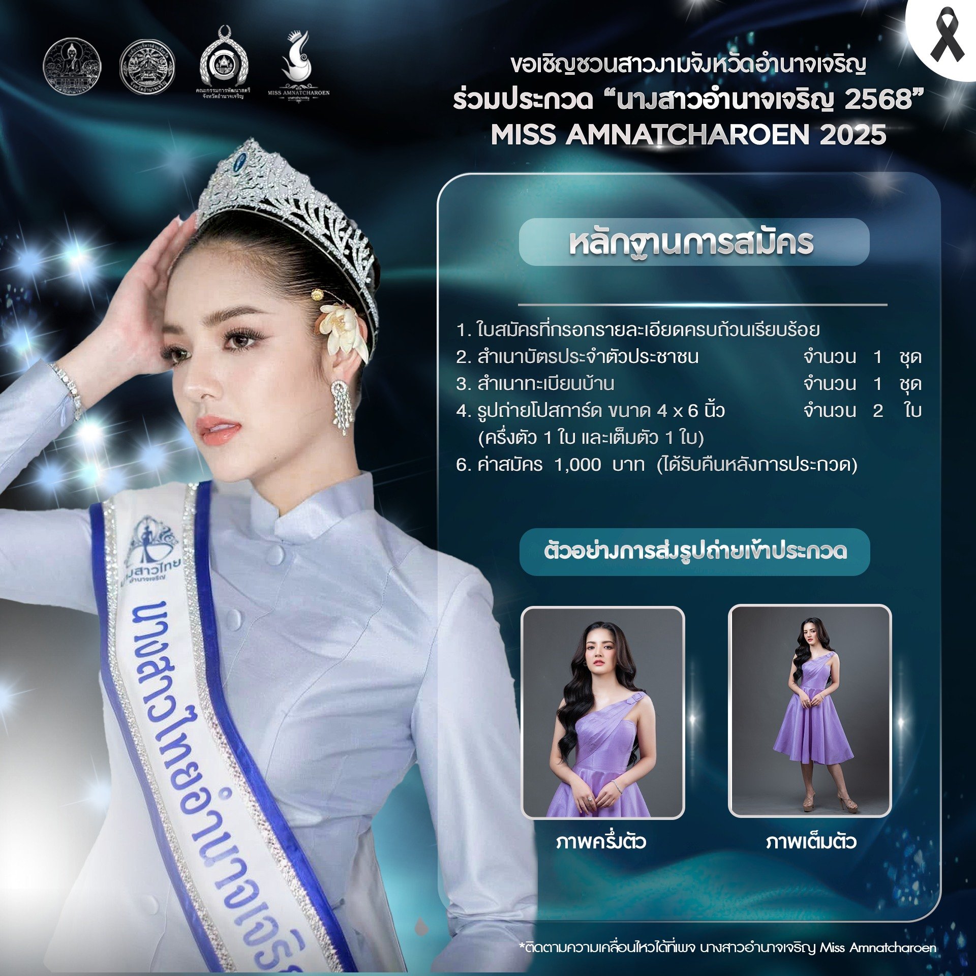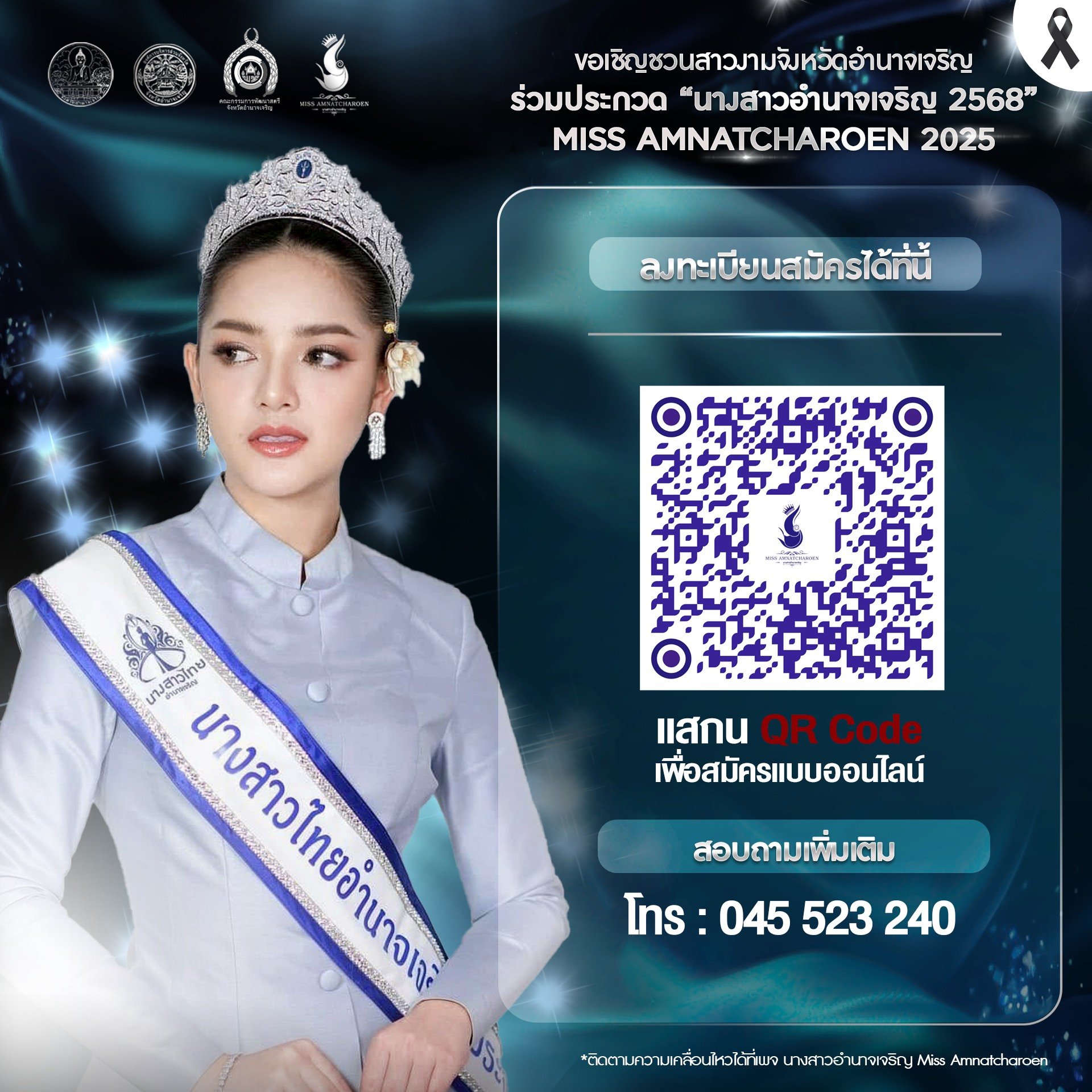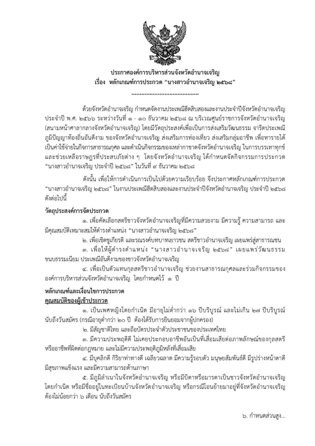 อบจ.อำนาจเจริญ ขอเชิญสมัครเข้าร่วมการประกวดนางสาวอำนาจเจริญ ประจำปี 2568 เพื่อคัดเลือกสตรีชาวจังหวัดอำนาจเจริญที่มีความสวยงาม มีความรู้ ความสามารถ และ มีคุณสมบัติเหมาะสมให้ดำรงตำแหน่ง “นางสาวอำนาจเจริญ 2568