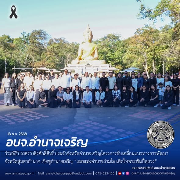 วันที่ 18 ธันวาคม 2568 เวลา 08.09 น. ณ พุทธอุทยาน พระมงคลมิ่งเมือง จังหวัดอำนาจเจริญ นายพนัส พันธุ์วรรณ นายกอบจ.อำนาจเจริญ เป็นประธานพิธีบวงสรวงสิ่งศักดิ์สิทธิ์ประจำจังหวัดอำนาจเจริญ โครงการขับเคลื่อนแนวทางการพัฒนาจังหวัดสู่มหาอำนาจ เชิดชูอำนาจเจริญ “แสงแห่งอำนาจร่วมใจ เทิดไทพระพันปีหลวง“