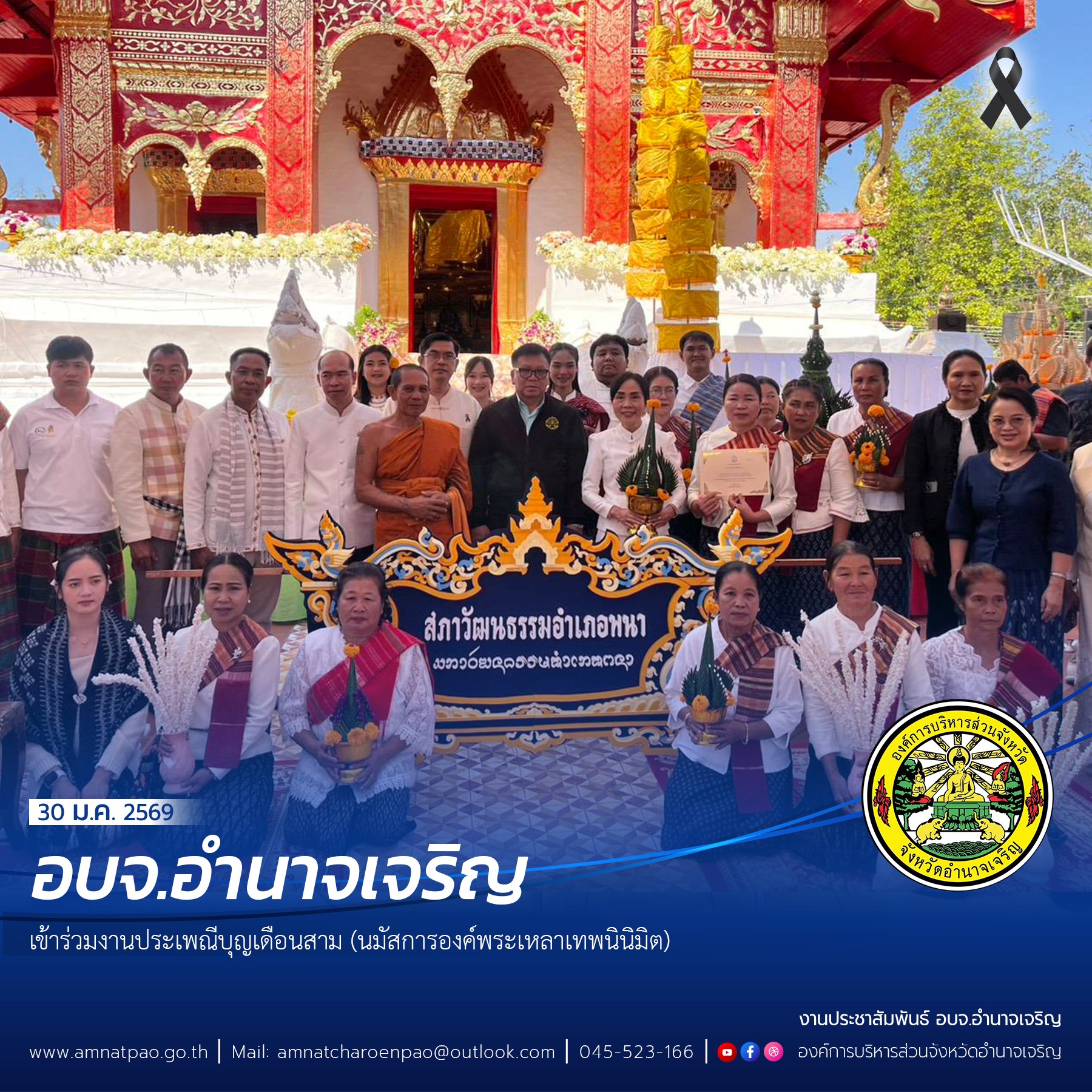 วันที่ 30 มกราคม พ.ศ. 2569 เวลา 08.30 น. องค์การบริหารส่วนจังหวัดอำนาจเจริญร่วมจัดงานประเพณีบุญเดือนสามนมัสการองค์พระเหลาเทพนินิมิต
