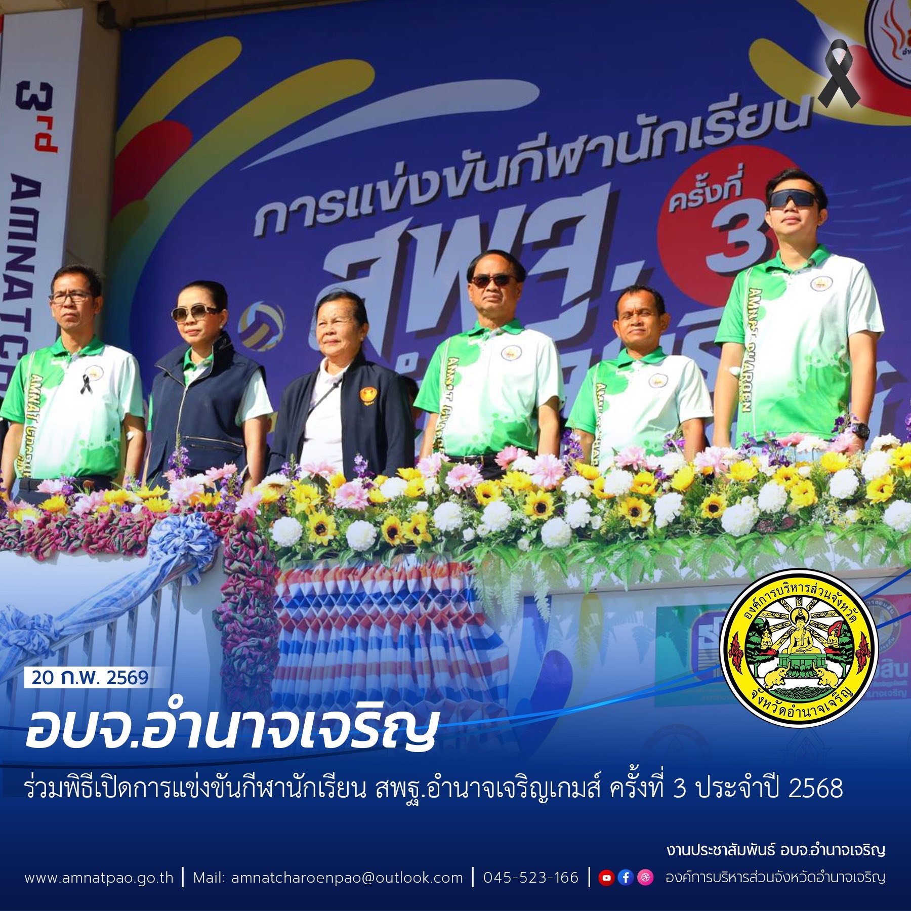 วันที่ 20 กุมภาพันธ์ 2569 เวลา 08.00 น. อบจ.อำนาจเจริญ ร่วมพิธีเปิดการแข่งขันกีฬานักเรียน สพฐ.อำนาจเจริญ ครั้งที่ 3 ประจำปี 2568