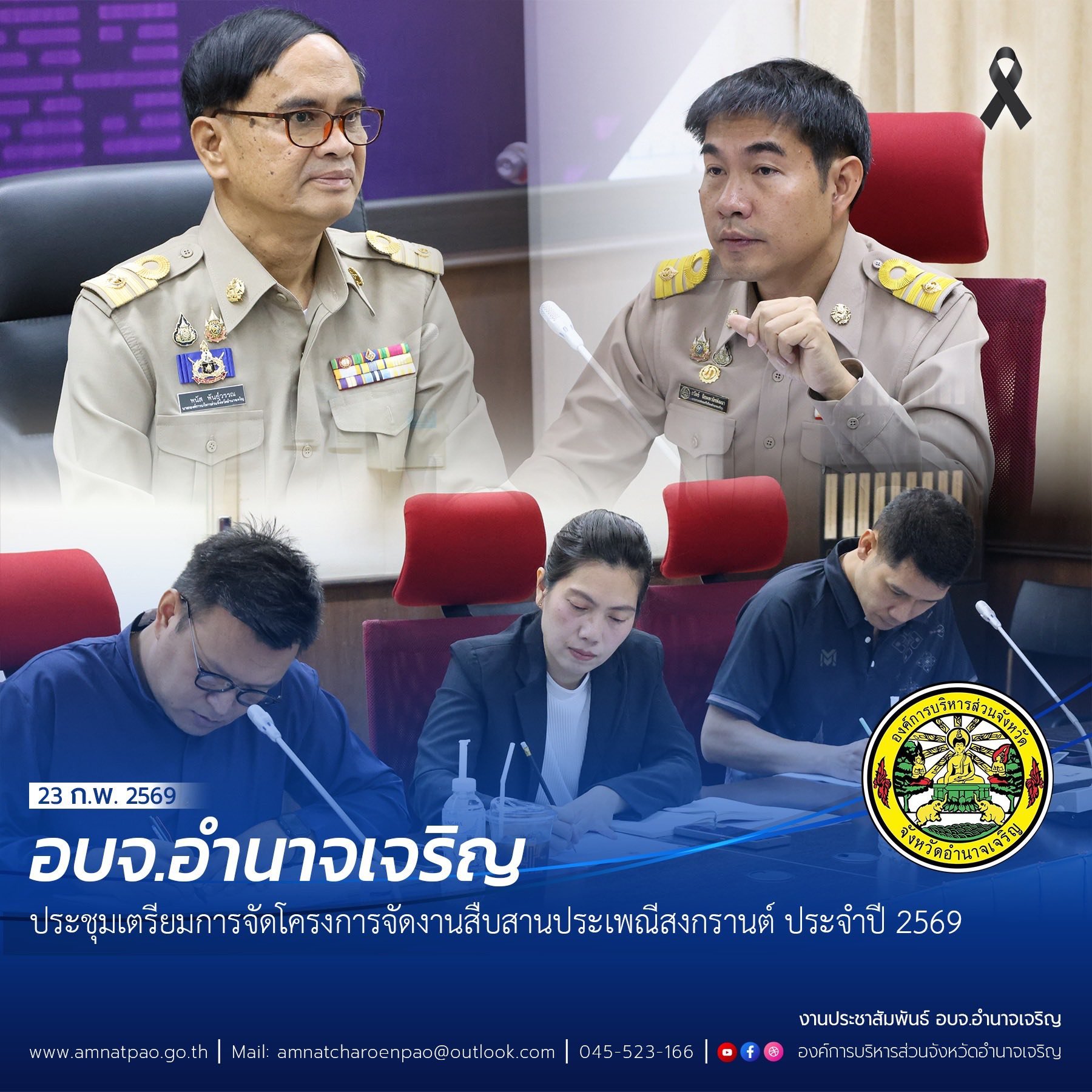 วันที่ 23 กุมภาพันธ์ 2569 เวลา 09.00 น. ณ ห้องประชุม Room 1103 อบจ.อำนาจเจริญ อ.เมืองอำนาจเจริญ จังหวัดอำนาจเจริญ นายพนัส พันธุ์วรรณ นายก อบจ.อำนาจเจริญ เป็นประธานประชุมเตรียมการจัดโครงการจัดงานสืบสานประเพณีสงกรานต์ ประจำปี 2569 โดยมีนายถวัลย์ นิยมพานิชพัฒนา นายกเทศมนตรีเมืองอำนาจเจริญ คณะผู้บริหาร หัวหน้าส่วนข้าราชการ ข้าราชการในสังกัด อบจ.อำนาจเจริญ และสังกัด เทศบาลเมืองอำนาจเจริญ เข้าร่วมประชุมในครังนี้