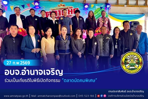 วันที่ (27 กุมภาพันธ์ 2569) เวลา 08.30 น. นายพนัส พันธุ์วรรณ นายกองค์การบริหารส่วนจังหวัดอำนาจเจริญ มอบหมายให้นางประกาย กองทอง ที่ปรึกษานายกองค์การบริหารส่วนจังหวัดอำนาจเจริญ ร่วมเป็นเกียรติในพิธีเปิดกิจกรรม “ตลาดนัดคนพิเศษ”