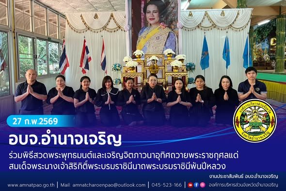 วันที่ (27 กุมภาพันธ์ 2569) เวลา 13.30 น. นายพนัส พันธุ์วรรณ นายกองค์การบริหารส่วนจังหวัดอำนาจเจริญ มอบหมายให้นางประกาย กองทอง ที่ปรึกษานายกองค์การบริหารส่วนจังหวัดอำนาจเจริญ พร้อมด้วยบุคลากรในสังกัดองค์การบริหารส่วนจังหวัดอำนาจเจริญ เข้าร่วมพิธีสวดพระพุทธมนต์และเจริญจิตภาวนาอุทิศถวายพระราชกุศลแด่สมเด็จพระนางเจ้าสิริกิติ์พระบรมราชินีนาถพระบรมราชินีพันปีหลวง