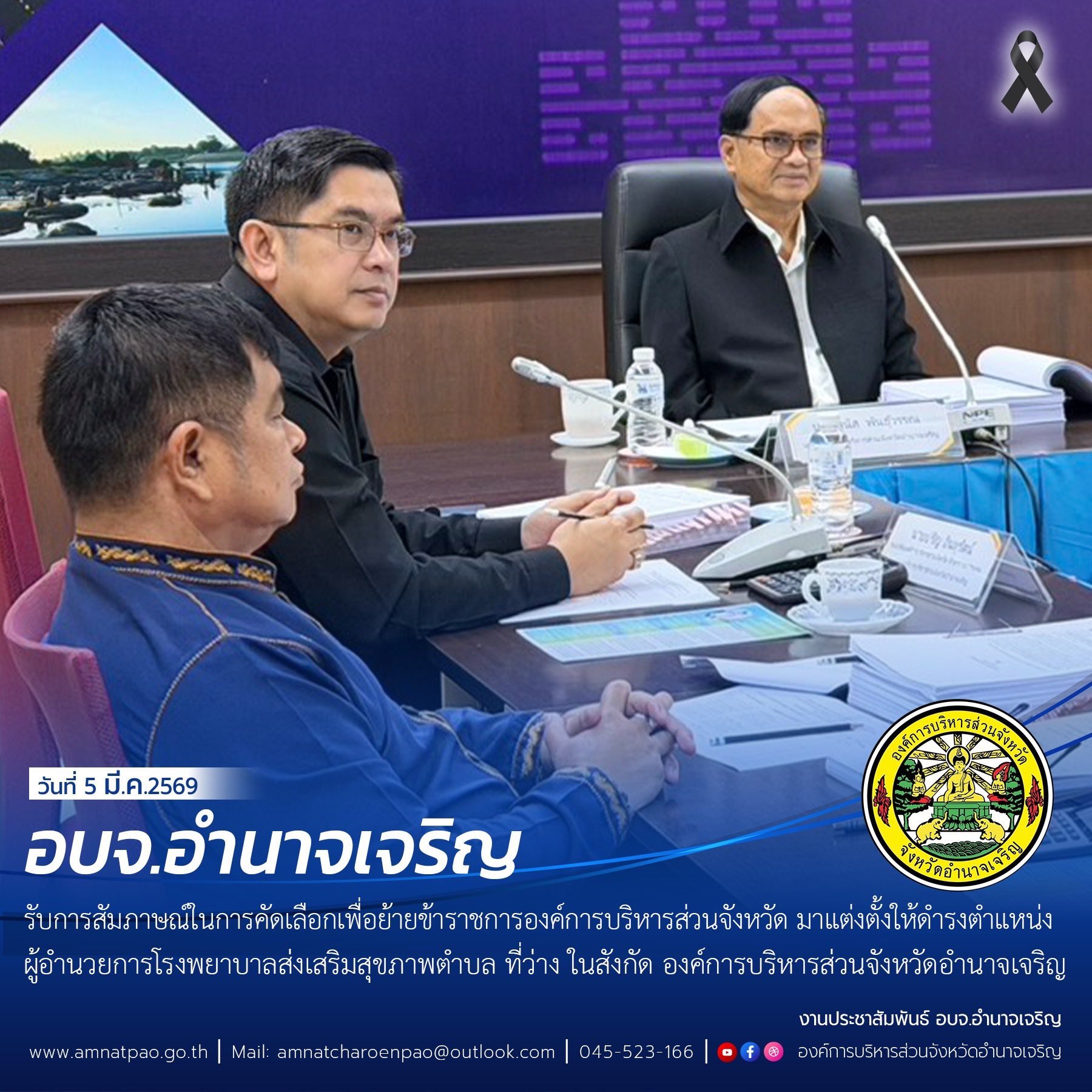 วันที่ 5 มีนาคม 2569 เวลา 09.00 น. ณ ห้องประชุม Room 1103 อบจ.อำนาจเจริญ นายพนัส พันธุ์วรรณ นายก อบจ.อำนาจเจริญ เป็นประธานคณะกรรมการ สอบสัมภาษณ์ในการคัดเลือกเพื่อย้ายข้าราชการองค์การบริหารส่วนจังหวัด เพื่อแต่งตั้งให้ดำรงตำแหน่งผู้อำนวยการโรงพยาบาลส่งเสริมสุขภาพตำบล ที่ว่าง ในสังกัด องค์การบริหารส่วนจังหวัดอำนาจเจริญ พร้อมคณะกรรมการที่เกี่ยวข้อง รับการสัมภาษณ์ในการคัดเลือกในครั้งนี้