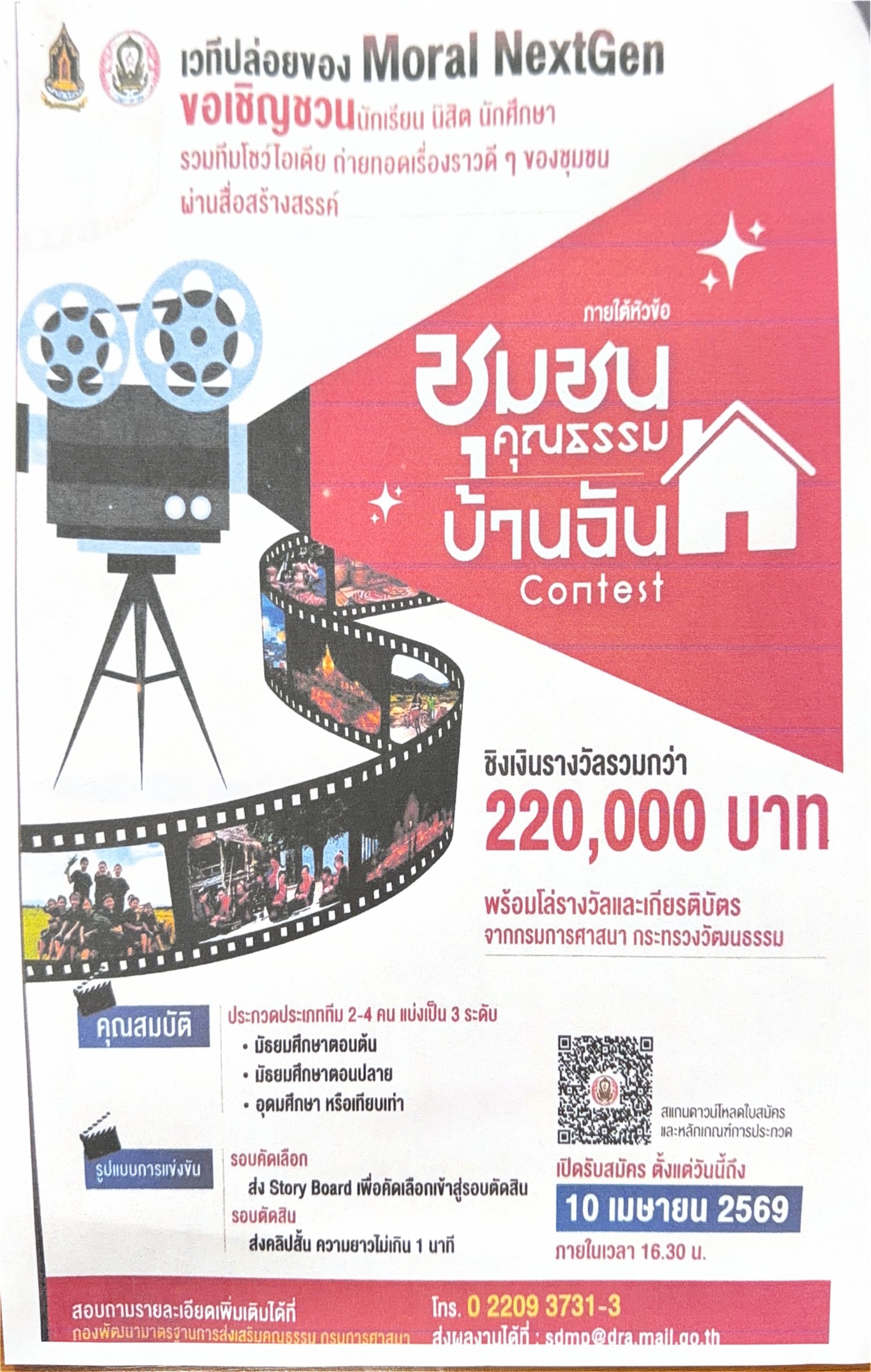 ประกาศ เรื่อง กิจกรรมการประกวดการผลิตสื่อคุณธรรมสำหรับเด็กเเละเยาวชน ภายใต้หัวข้อ "ชุมชนคุณธรรมบ้านฉัน" ประจำปีงบประมาณ พ.ศ. 2569 เปิดรับสมัคร ตั้งแต่วันนี้-10 เมษายน 2569 ภายในเวลา 16.30 น.