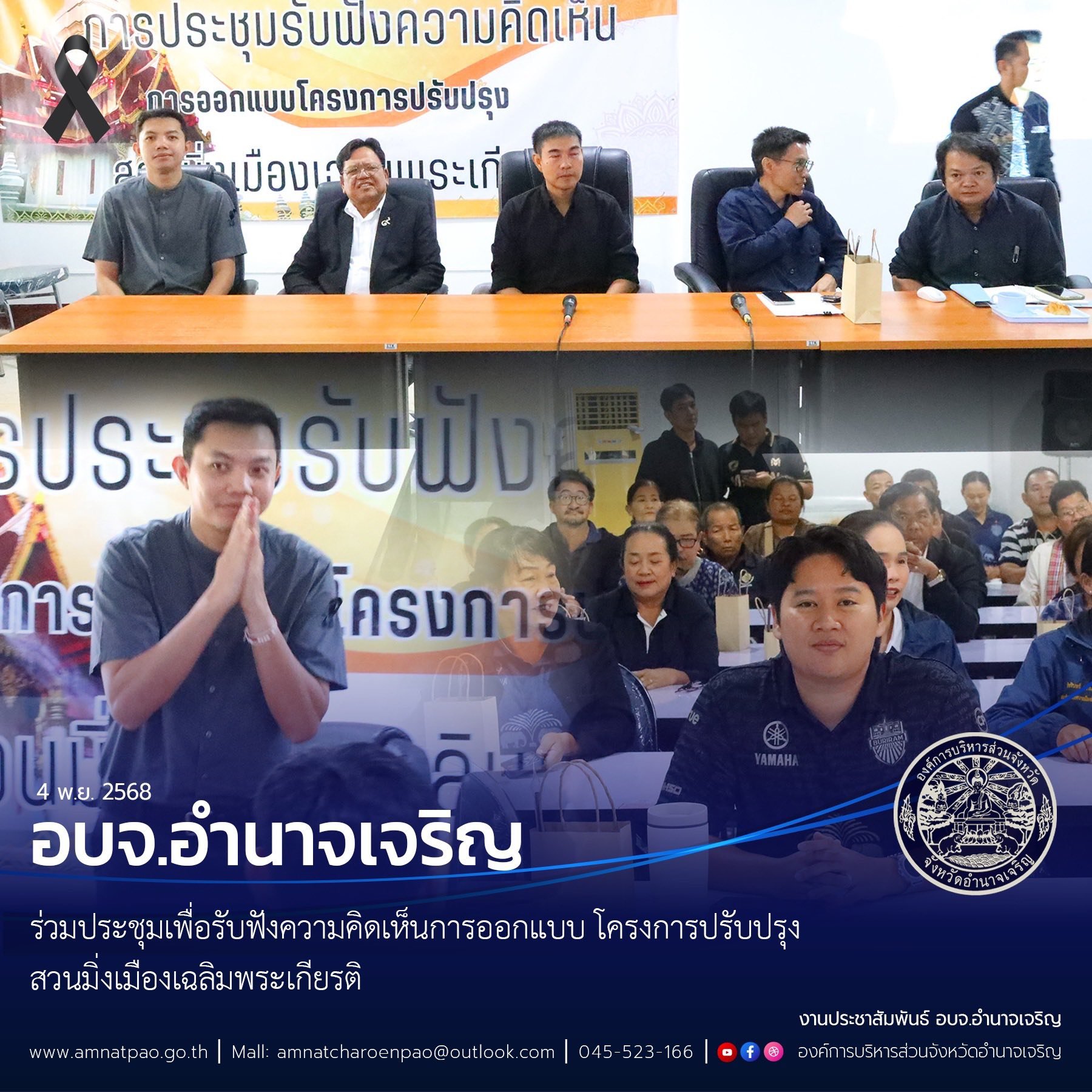 วันที่ 4 พ.ย. 2568 เวลา 09.00 น. อบจ.อำนาจเจริญ ร่วมประชุมเพื่อรับฟังความคิดเห็นการออกแบบ โครงการปรับปรุงสวนมิ่งเมืองเฉลิมพระเกียรติ