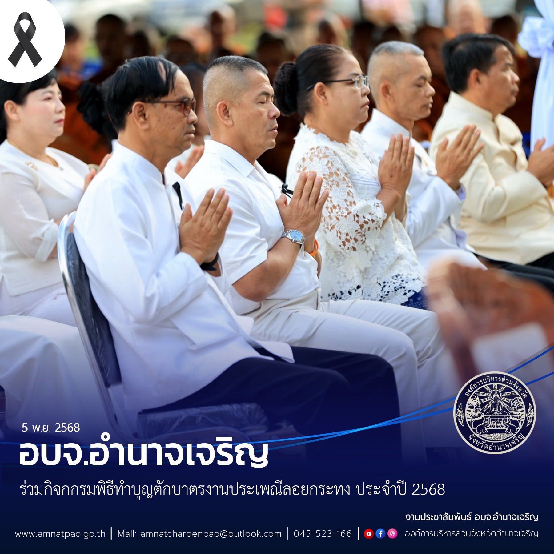 วันที่ 5 พ.ย. 2568 เวลา 06.00 น. อบจ.อำนาจเจริญ ร่วมพิธีทำบุญตักบาตรสืบสานประเพณีลอยกระทง ประจำปี 2568