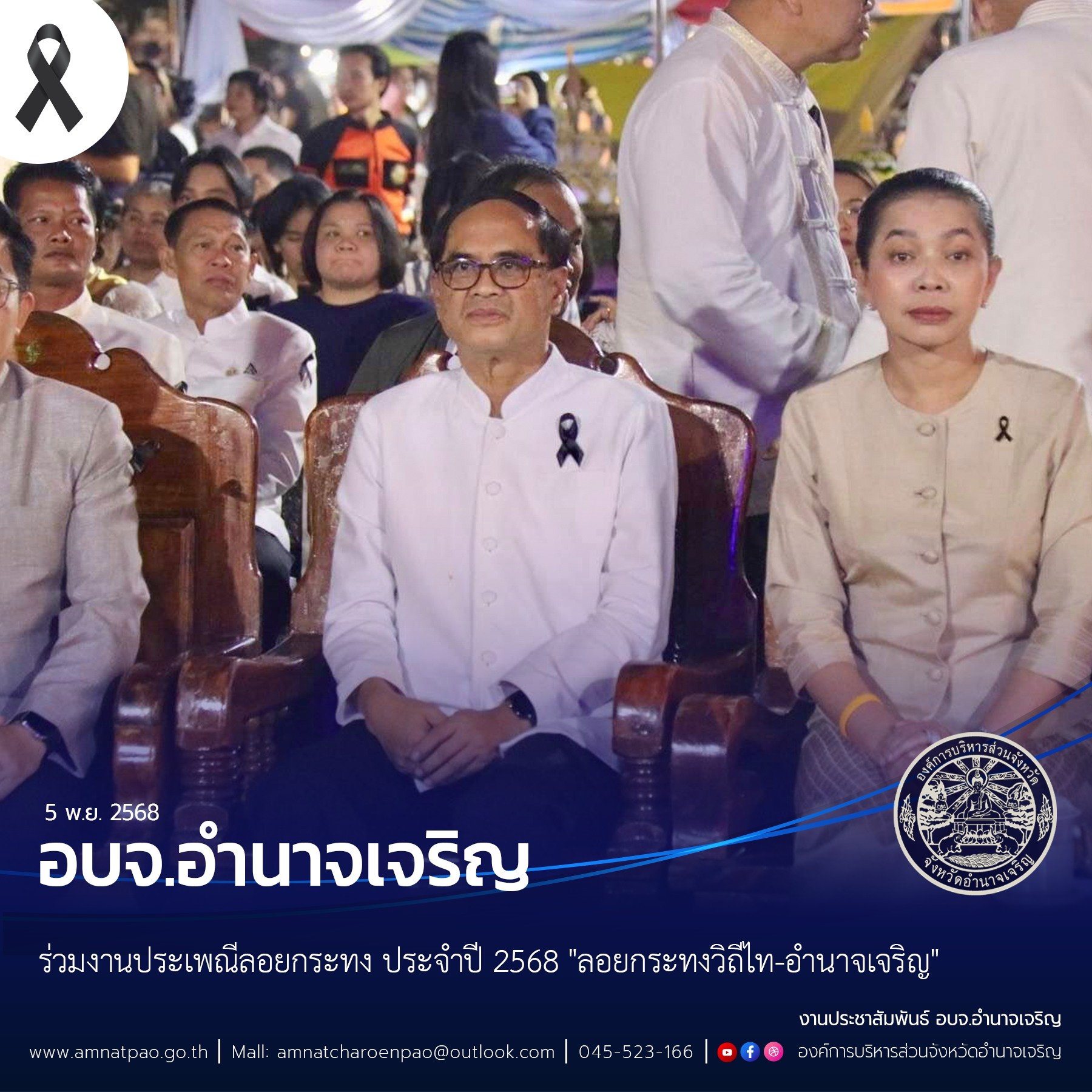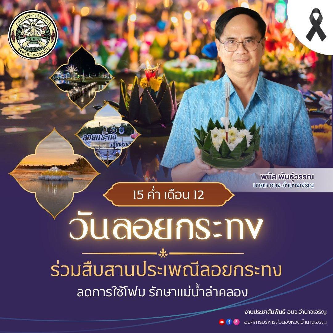 วันที่ 5 พ.ย. 2568 เวลา 18.00 น. อบจ.อำนาจเจริญ ร่วมงานประเพณีลอยกระทง ประจำปี 2568 "ลอยกระทงวิถีไท-อำนาจเจริญ"
