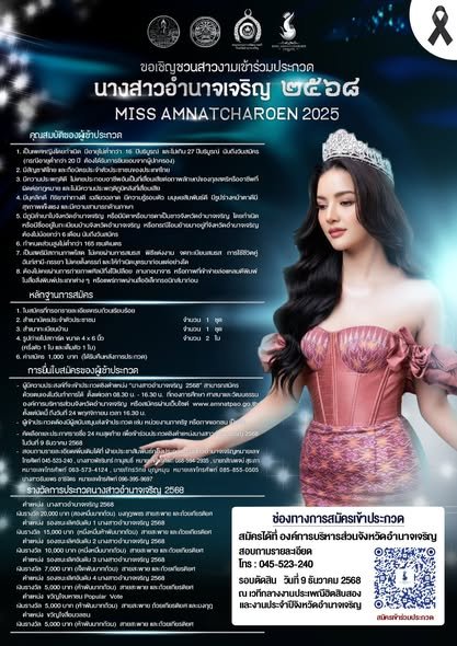 อบจ.อำนาจเจริญ ขอเชิญสมัครเข้าร่วมการประกวดนางสาวอำนาจเจริญ ประจำปี 2568 เพื่อคัดเลือกสตรีชาวจังหวัดอำนาจเจริญที่มีความสวยงาม มีความรู้ ความสามารถ และ มีคุณสมบัติเหมาะสมให้ดำรงตำแหน่ง “นางสาวอำนาจเจริญ 2568