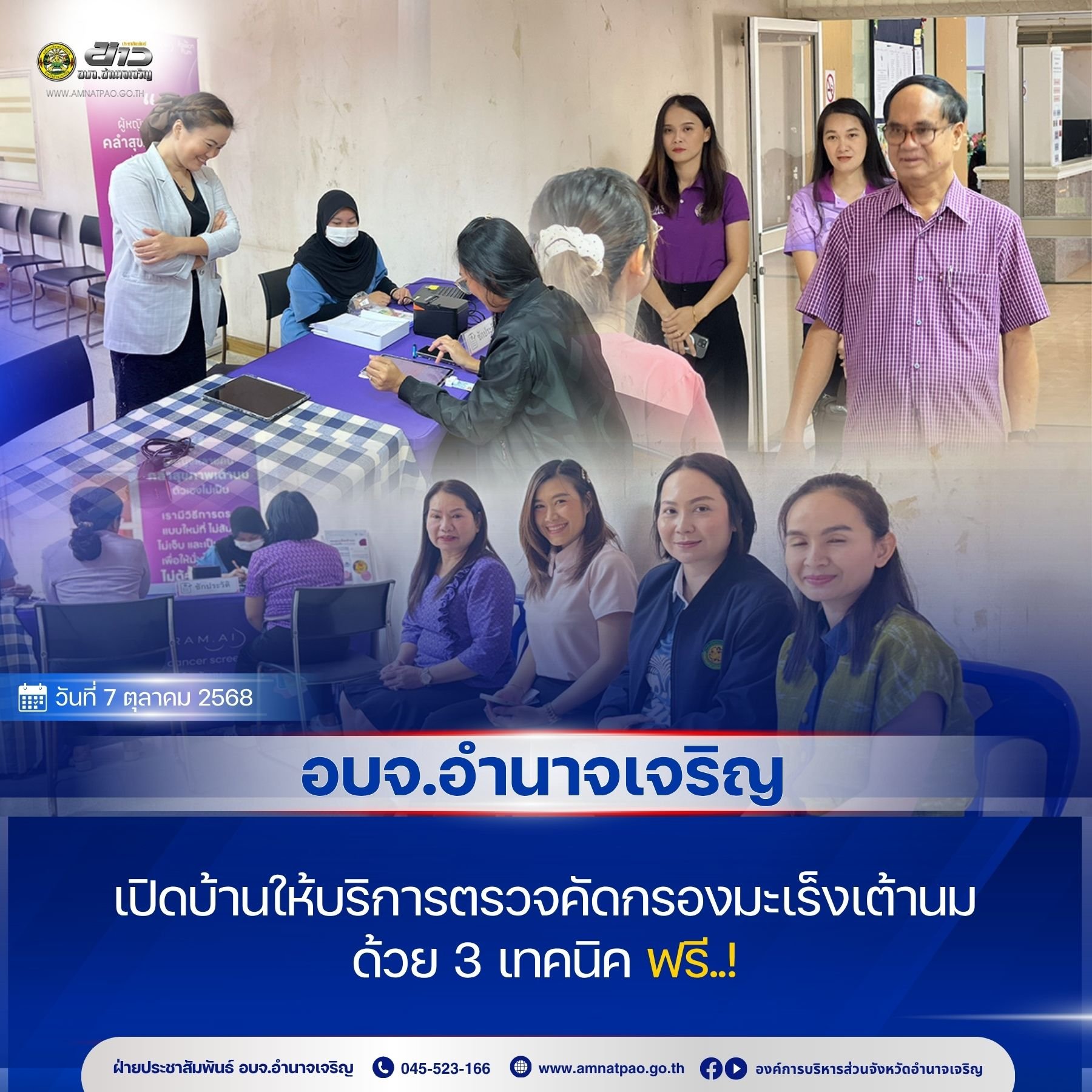 วันที่ 7 ตุลาคม 2568 เวลา 07.00 น. อบจ.อำนาจเจริญ เปิดบ้านให้บริการตรวจคัดกรองมะเร็งเต้านมด้วย 3 เทคนิค ฟรี