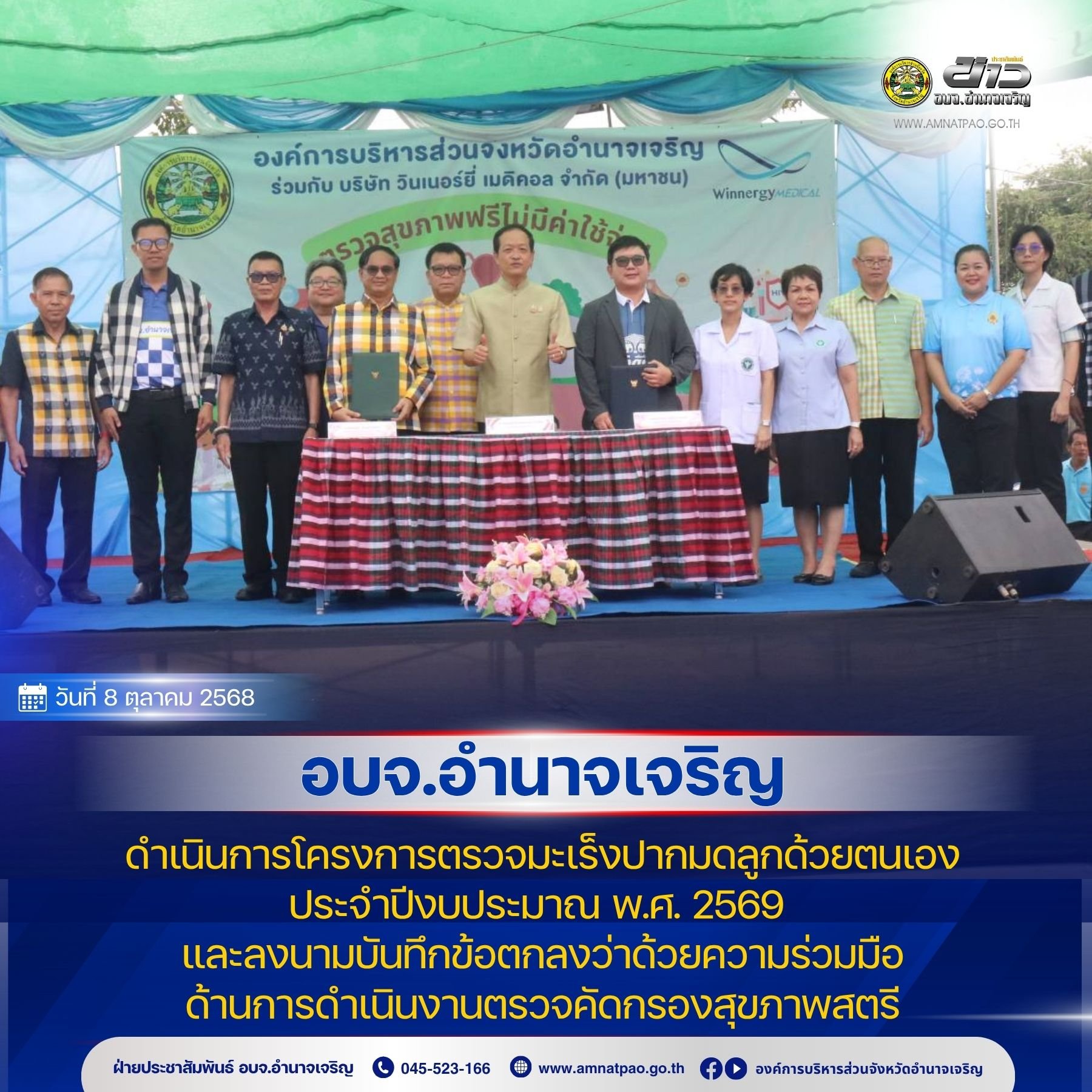 วันที่ 8 ตุลาคม 2568 เวลา 09.00 น. อบจ.อำนาจเจริญ ดำเนินการโครงการตรวจมะเร็งปากมดลูกด้วยตนเอง ประจำปีงบประมาณ พ.ศ. 2569 และลงนามบันทึกข้อตกลงว่าด้วยความร่วมมือด้านการดำเนินงานตรวจคัดกรองสุขภาพสตรี