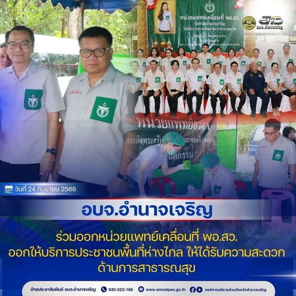 วันนี้ (24 ก.ย.68) เวลา 09.00 น. อบจ.อำนาจเจริญ ร่วมออกหน่วยแพทย์เคลื่อนที่ พอ.สว. ออกให้บริการประชาชนพื้นที่ห่างไกล ให้ได้รับความสะดวก ด้านการสาธารณสุข