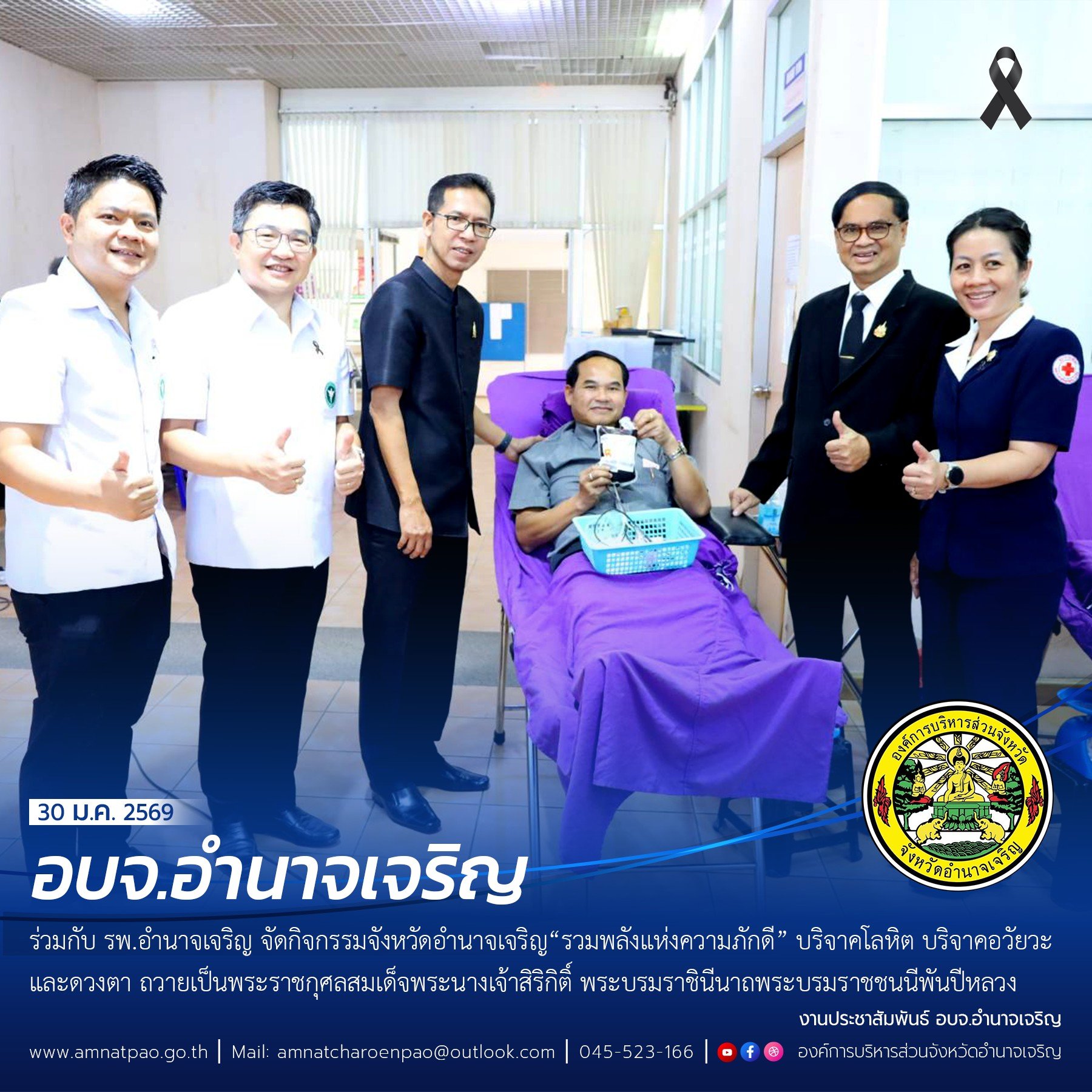วันที่ 30 มกราคม พ.ศ. 2569 เวลา 09.00 น. องค์การบริหารส่วนจังหวัดอำนาจเจริญ  ร่วมกับ โรงพยาบาลอำนาจเจริญ จัดกิจกรรม จังหวัดอำนาจเจริญ “รวมพลังแห่งความภักดี” บริจาคโลหิต บริจาคอวัยวะและดวงตา ถวายเป็นพระราชกุศลสมเด็จพระนางเจ้าสิริกิติ์ พระบรมราชินีนาถพระบรมราชชนนีพันปีหลวง