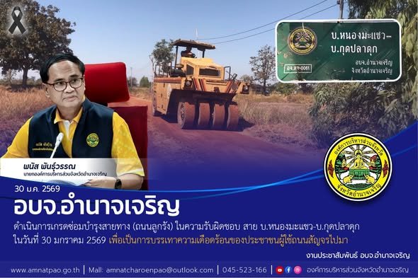 อบจ.อำนาจเจริญ ดำเนินการเกรดซ่อมบำรุงสายทาง (ถนนลูกรัง) ในความรับผิดชอบ สาย บ.หนองมะแชว-บ.กุดปลาดุก อ.เมือง จ.อำนาจเจริญ ในวันที่ 30 มกราคม 2569 เพื่อเป็นการบรรเทาความเดือดร้อนของประชาชนผู้ใช้ถนนสัญจรไปมา