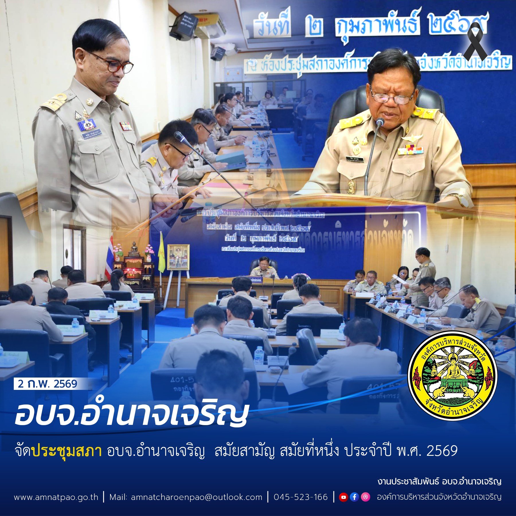วันที่ (2 ก.พ.69 ) เวลา 10.00 น. อบจ.อำนาจเจริญ จัดประชุมสภา อบจ.อำนาจเจริญ สมัยสามัญ สมัยที่หนึ่ง ประจำปี พ.ศ. 2569