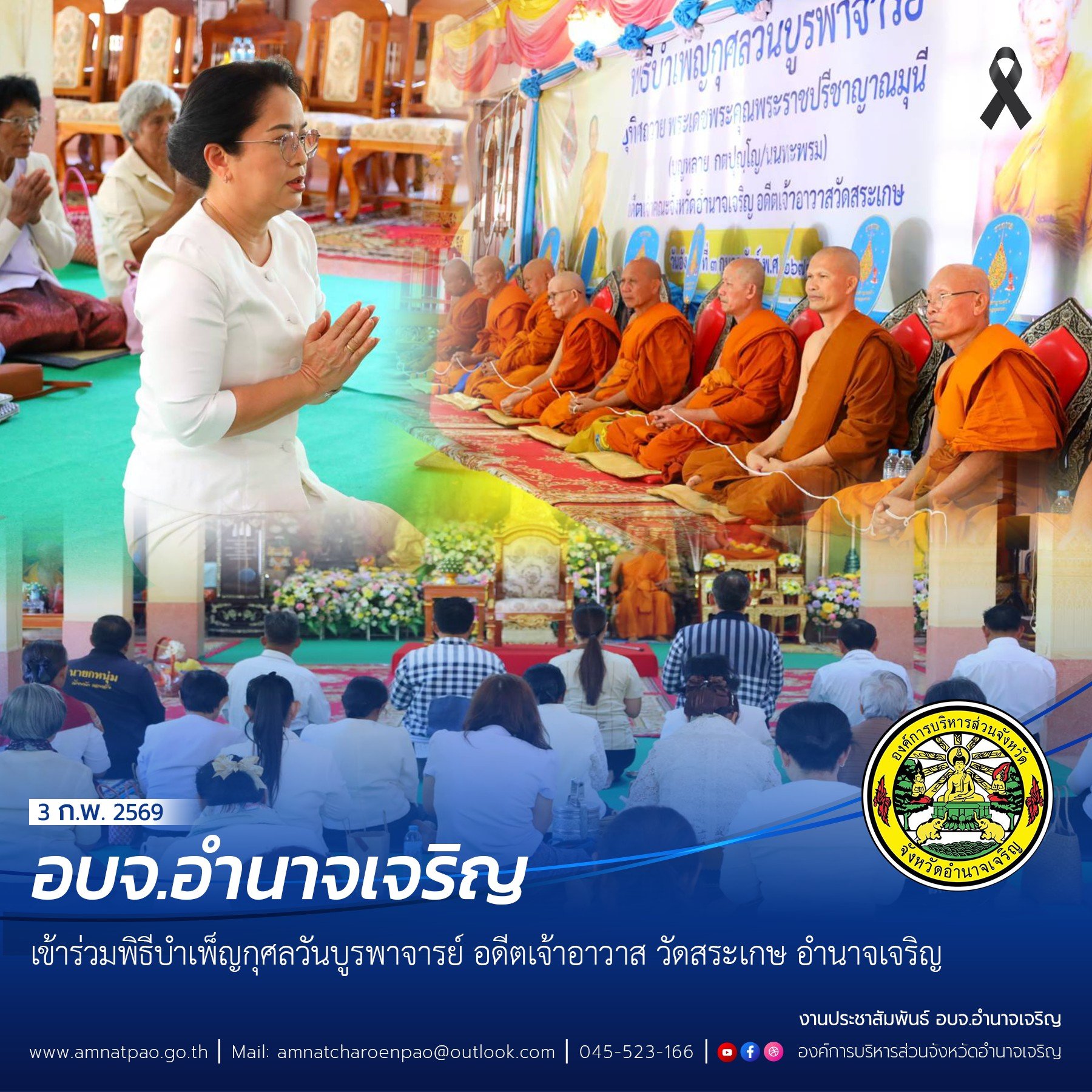 วันที่ (3 กุมภาพันธ์ 2569) เวลา 09.30 น. อบจ.อำนาจเจริญ เข้าร่วมพิธีบำเพ็ญกุศลวันบูรพาจารย์ อดีตเจ้าอาวาส วัดสระเกษ อำนาจเจริญ