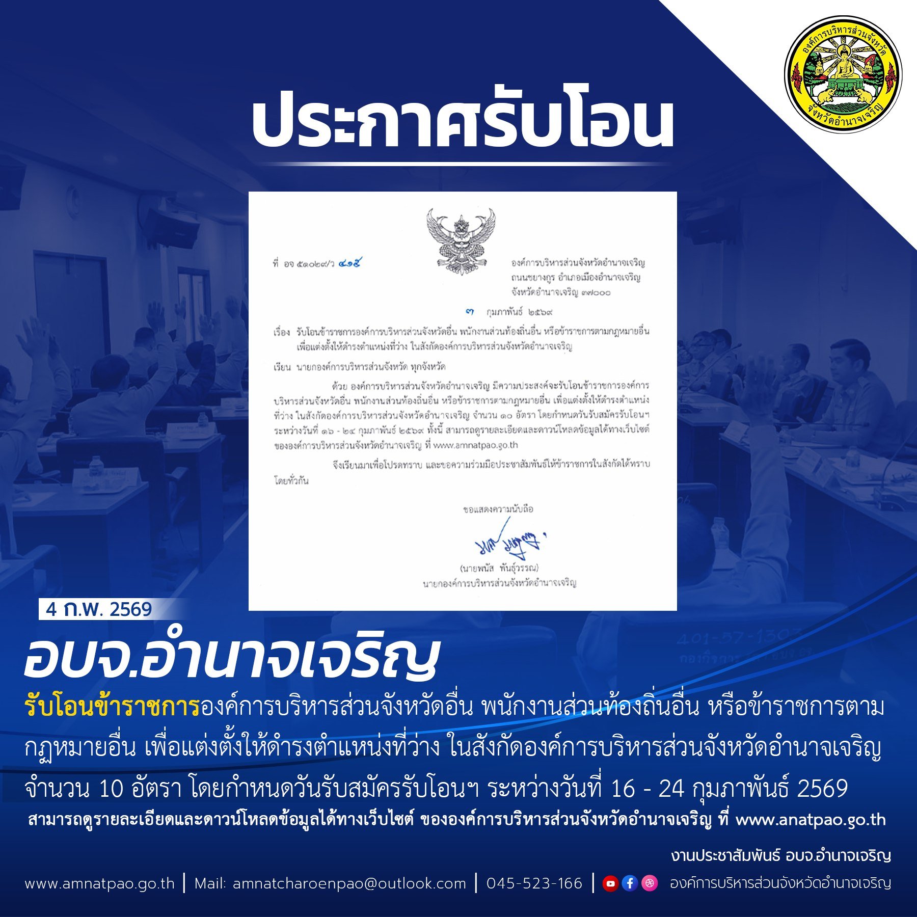 ประชาสัมพันธ์ อบจ.อำนาจเจริญ รับโอนข้าราชการองค์การบริหารส่วนจังหวัดอื่น พนักงานส่วนท้องถิ่นอื่น หรือข้าราชการตามกฏหมายอื่น เพื่อแต่งตั้งให้ดำรงตำแหน่งที่ว่าง ในสังกัดองค์การบริหารส่วนจังหวัดอำนาจเจริญ จำนวน 10 อัตรา โดยกำหนดวันรับสมัครรับโอนฯ ระหว่างวันที่ 16 - 24 กุมภาพันธ์ 2569 ทั้งนี้ สามารถดูรายละเอียดและดาวน์โหลดข้อมูลได้ทางเว็บไซต์ ขององค์การบริหารส่วนจังหวัดอำนาจเจริญ