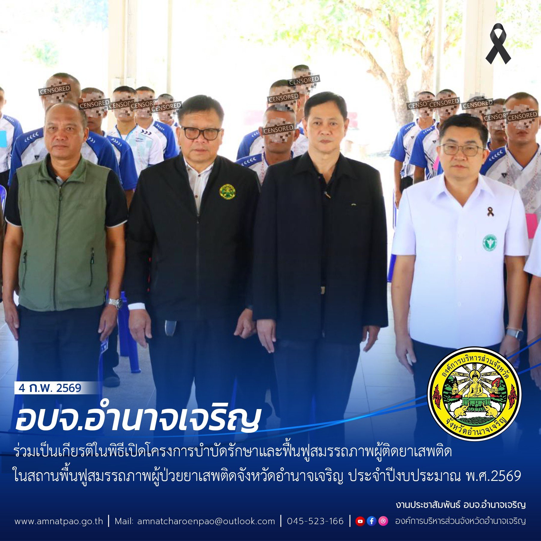 วันที่ (4 กุมภาพันธ์ 2569) เวลา 10.00 น. อบจ.อำนาจเจริญ ร่วมเป็นเกียรติในพิธีเปิดโครงการบำบัดรักษาและฟื้นฟูสมรรถภาพผู้ติดยาเสพติดในสถานพื้นฟูสมรรถภาพผู้ป่วยยาเสพติด จังหวัดอำนาจเจริญ ประจำปีงบประมาณ พ.ศ. 2569