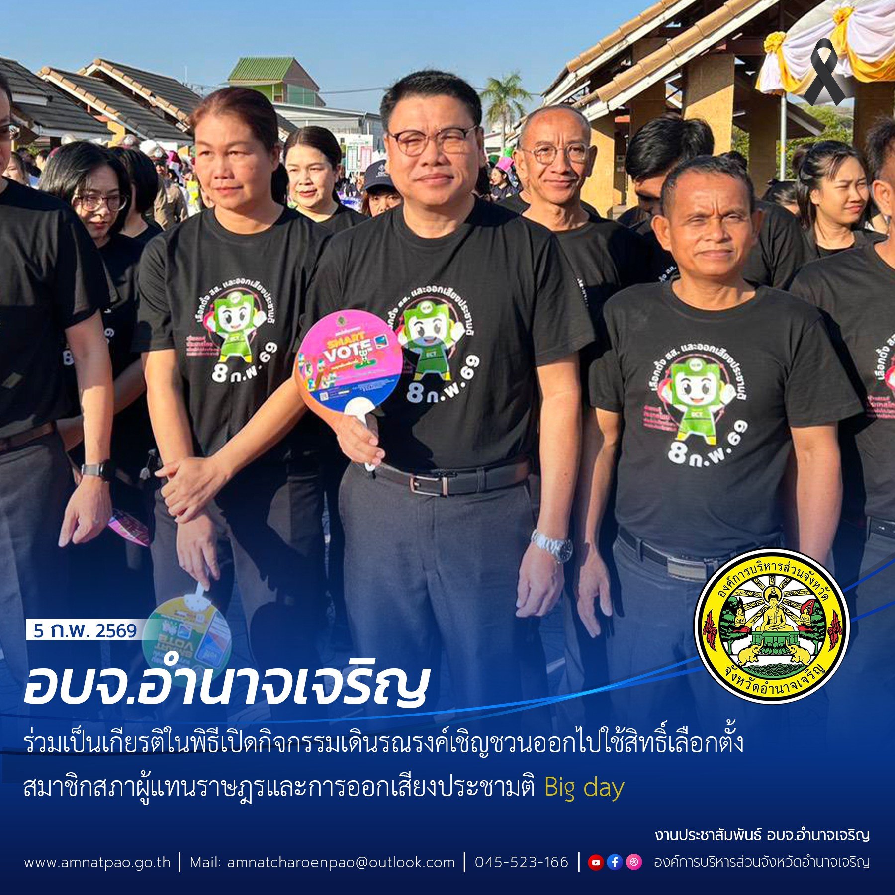 วันที่ (5 กุมภาพันธ์ 2569) เวลา 07.00 น. อบจ.อำนาจเจริญ ร่วมเป็นเกียรติในพิธีเปิดกิจกรรมเดินรณรงค์เชิญชวนออกไปใช้สิทธิ์เลือกตั้งสมาชิก สภาผู้แทนราษฎรและการออกเสียงประชามติ big day