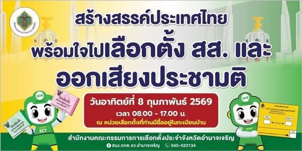 ขอเชิญชวนไปใช้สิทธิเลือกตั้งสมาชิกสภาผู้แทนราษฎรและ ออกเสียงประชามติ ในวันที่ 8 กุมภาพันธ์ 2569 ตั้งแต่เวลา 08:00 น. ถึง 17:00 น. ณ หน่วยเลือกตั้งที่ท่านมีชื่ออยู่ มีทะเบียนบ้าน