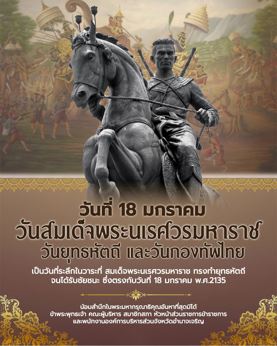 18 มกราคม 2569 วันสมเด็จพระนเรศวรมหาราช วันยุทธหัตถี และวันกองทัพไทย น้อมสำนึกในพระมหากรุณาธิคุณอันหาที่สุดมิได้ข้าพระพุทธเจ้า คณะผู้บริหาร สมาชิกสภา หัวหน้าส่วนราชการข้าราชการและพนักงานองค์การบริหารส่วนจังหวัดอำนาจเจริญ