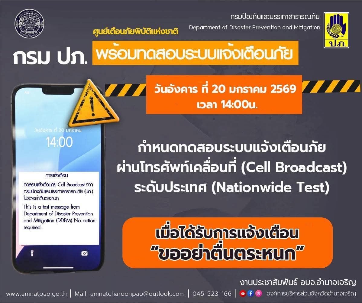 ข่าวประชาสัมพันธ์ กำหนดทดสอบระบบแจ้งเตือนภัย ผ่านโทรศัพท์เคลื่อนที่ วันนี้ 20 มกราคม 2569 เวลา 14.00 น. กรม ปภ. ศูนย์ภัยพิบัติแห่งชาติ กำหนดทดสอบระบบแจ้งเตือนภัย ผ่านโทรศัพท์เคลื่อนที่ (Cell Broadcast) ระดับประเทศ (Nationwide Test) ในวันอังคารที่ 20 มกราคม 2569 เวลา 14.00 น. #หมายเหตุ เมื่อได้รับการแจ้งเตือน “ขออย่าตื่นตระหนก”