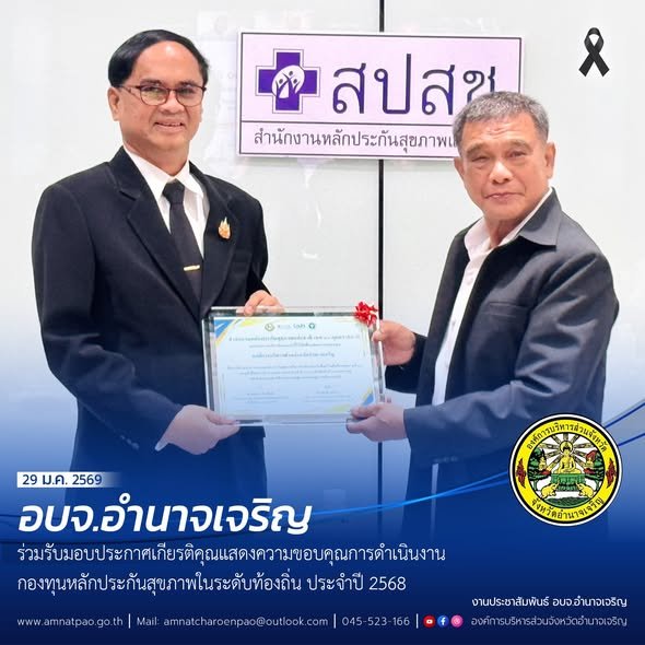 วันที่ (29 มกราคม 2569) เวลา 08.30 น. อบจ.อำนาจเจริญ ร่วมรับมอบประกาศเกียรติคุณ แสดงความขอบคุณการดำเนินงานกองทุนหลักประกันสุขภาพในระดับท้องถิ่นประจำปี 2568