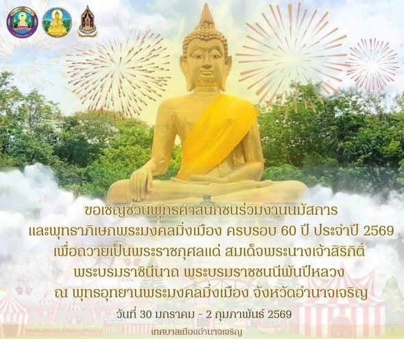 <img src="https://amnatpao.go.th/asset/images/new-icon.gif" class="img-new"> เนื่องในโอกาสครบรอบ 60 ปี พระมงคลมิ่งเมือง โดยคณะสงฆ์มีมติให้เป็น บุญใหญ่มอบเ...