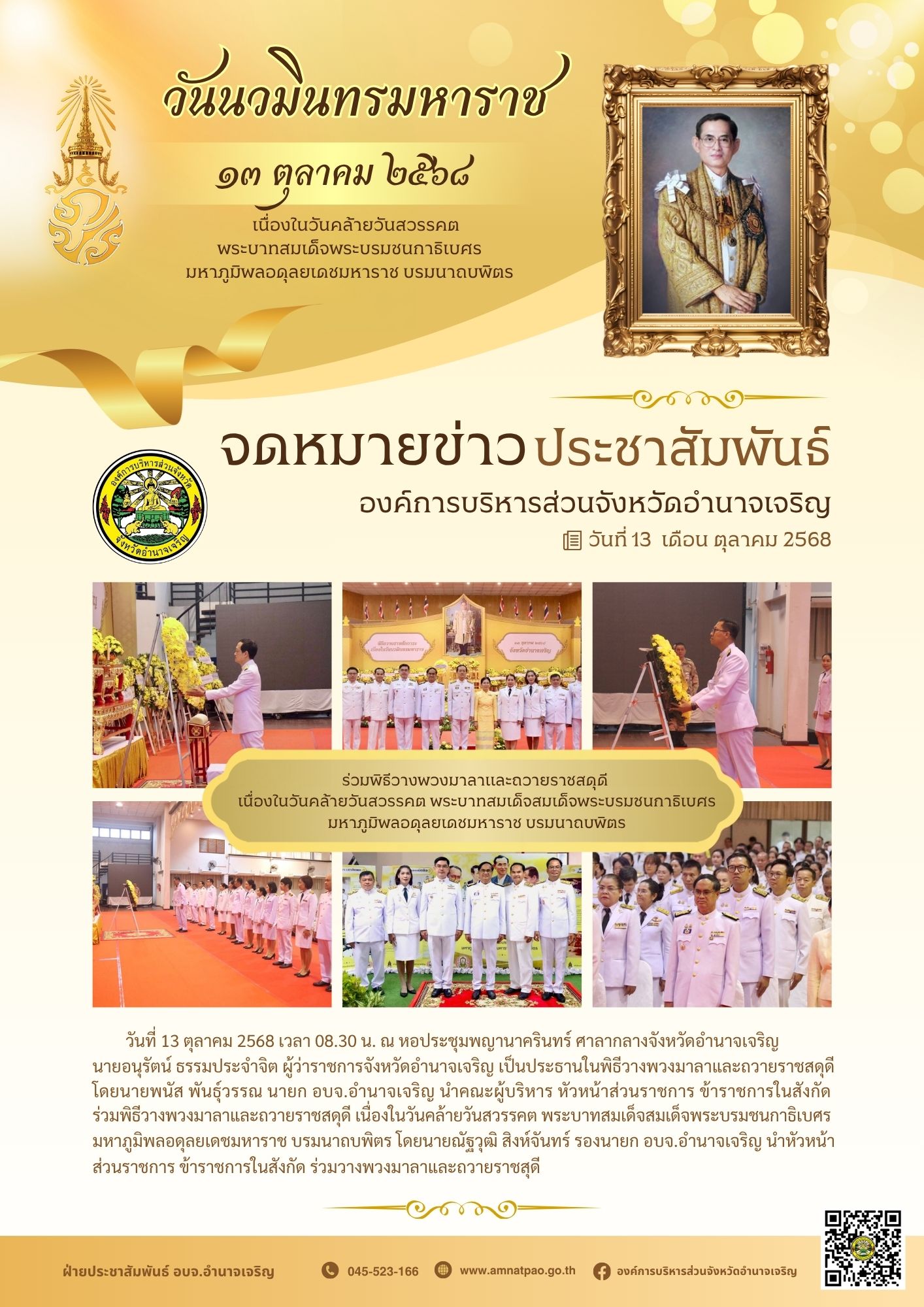 วันนี้ 14 พ.ย. 2568 เวลา 07.30 น. อบจ.อำนาจเจริญ ร่วมพิธีวางพานพุ่มดอกไม้สดถวายราชสักการะพระบาทสมเด็จพระบรมชนกาธิเบศร มหาภูมิพลอดุลยเดชมหาราช บรมนาถบพิตร เนื่องในวันพระบิดาแห่งฝนหลวง ประจำปี 2568