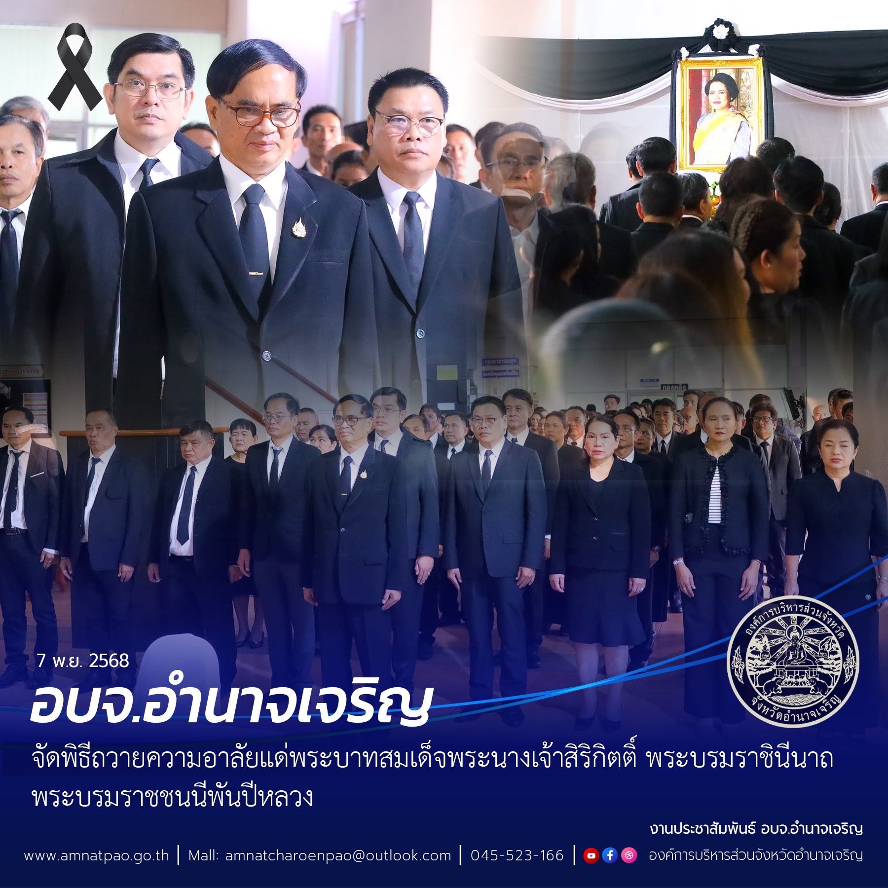 วันที่ 7 พฤศจิกายน 2568 เวลา 13.00 น. อบจ.อำนาจเจริญ จัดพิธีถวายความอาลัยแด่สมเด็จพระนางเจ้าสิริกิติ์ พระบรมราชินีนาถ พระบรมราชชนนีพันปีหลวง