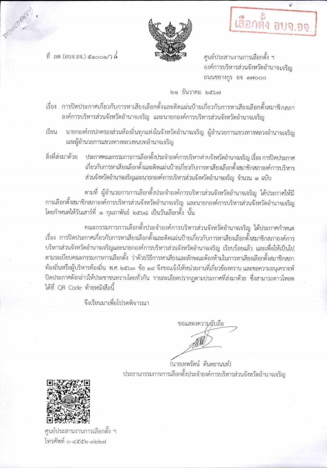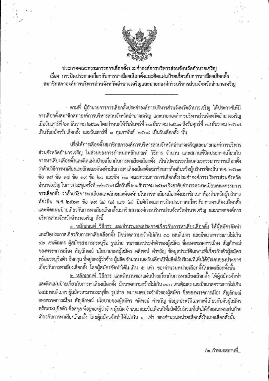 ประกาศคณะกรรมการการเลือกตั้งประจำองค์การบริหารส่วนจังหวัดอำนาจเจริญ เรื่อง การปิดประกาศเกี่ยวกับการหาเสียงเลือกตั้งและติดแผ่นป้ายเกี่ยวกับการหาเสียงเลือกตั้ง สมาชิกสภาองค์การบริหารส่วนจังหวัดอำนาจเจริญและนายกองค์การบริหารส่วนจังหวัดอำนาจเจริญ