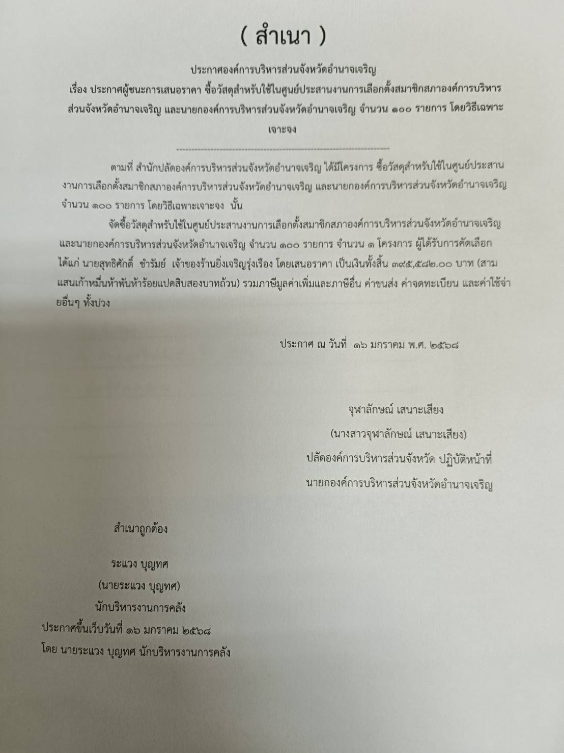 ประกาศผู้ชนะการเสนอราคา ซื้อวัสดุสำหรับใช้ในศูนย์ประสานงานการเลือกตั้งสมาชิกสภาองค์การบริหารส่วนจังหวัดอำนาจเจริญ เเละ นายกองค์การบริหารส่วนจังหวัดอำนาจเจริญ ประจำอำเภอเมืองอำนาจเจริญ จำนวน 100 รายการ โดยวิธีเฉพาะเจาะจง ประกาศ ณ วันที่ 16 มกราคม 2568