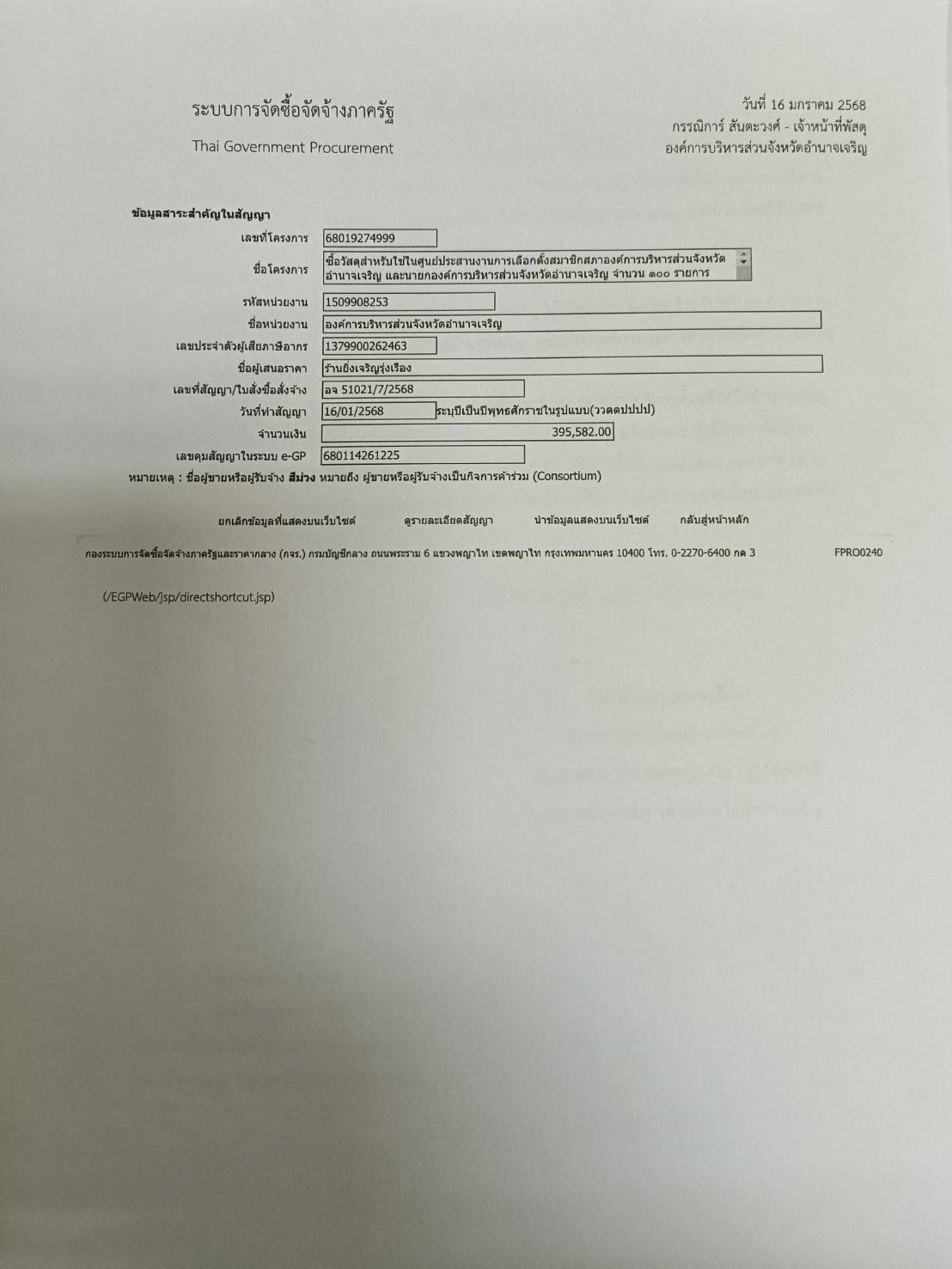 เลขที่โครงการ 68019274999 ซื้อวัสดุสำหรับใช้ในศูนย์ประสานงานการเลือกตั้งสมาชิกสภาองค์การบริหารส่วนจังหวัดอำนาจเจริญ เเละ นายกองค์การบริหารส่วนจังหวัดอำนาจเจริญ ประจำอำเภอเมืองอำนาจเจริญ จำนวน 100 รายการ โดยวิธีเฉพาะเจาะจง วันที่ทำสัญญา 16 มกราคม 2568