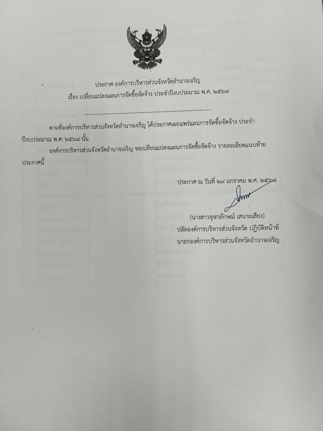 ประกาศ เรื่อง เปลี่ยนแปลงแผนการจัดซื้อจัดจ้าง ประจำปีงบประมาณ พ.ศ. 2568 ประกาศ ณ วันที่ 29 มกราคม พ.ศ. 2568
