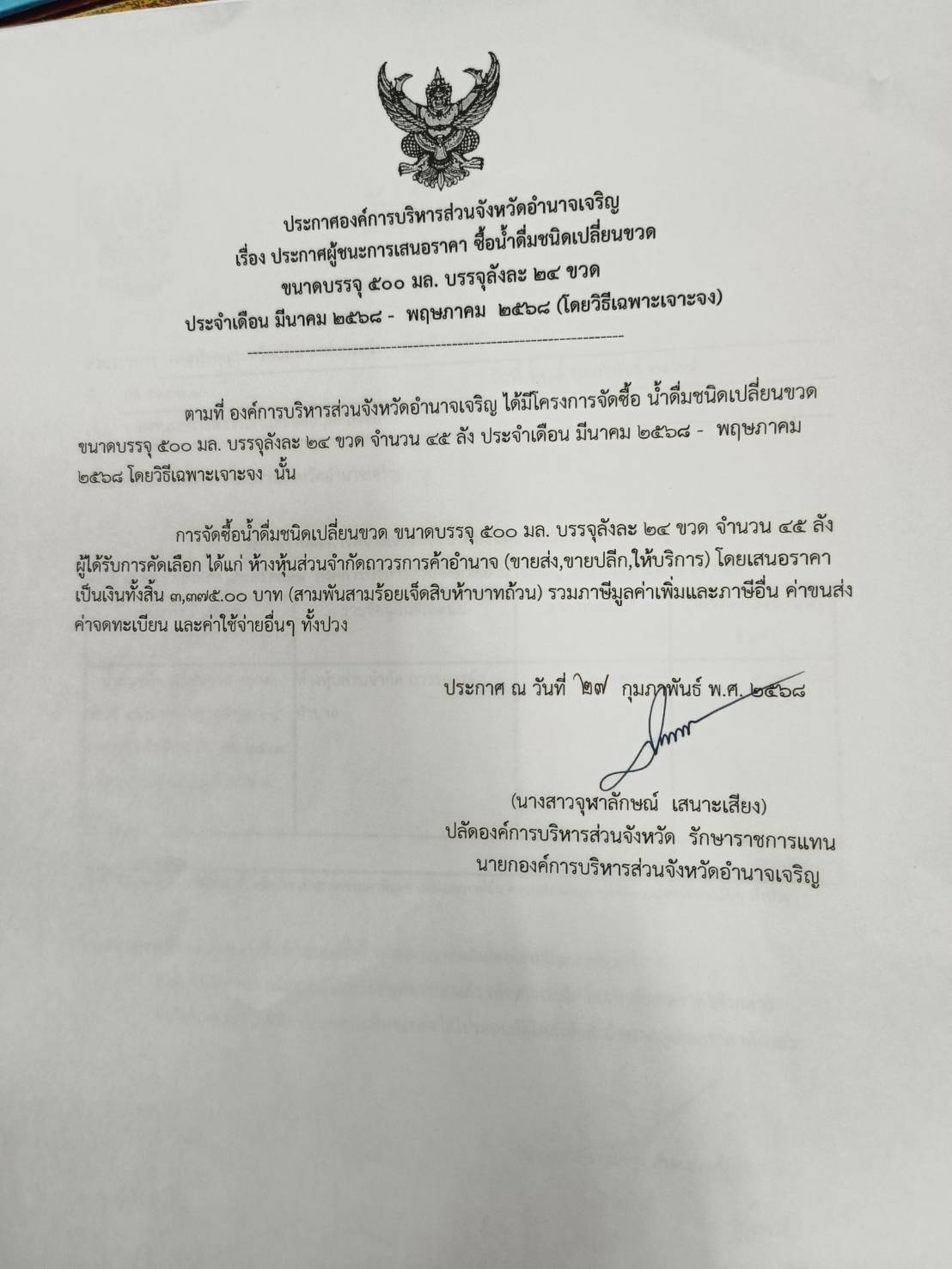 ประกาศผู้ชนะการเสนอราคา ซื้อน้ำดื่มชนิดเปลี่ยนขวด ขนาดบรรจุ 500 มล. บรรจุลังละ 24 ขวด ประจำเดือน มีนาคม 2568 - พฤษภาคม 2568 โดยวิธีเฉพาะเจาะจง ประกาศ ณ วันที่ 27 กุมภาพันธ์ 2568