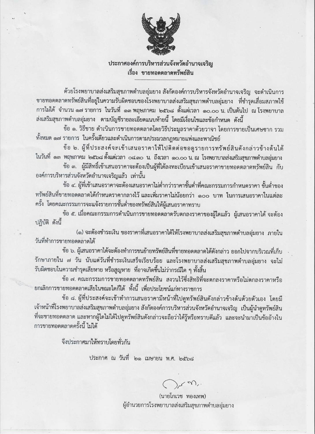 ประกาศ เรื่อง ขายทอดตลาดทรัพย์สิน โรงพยาบาลส่งเสริมสุขภาพตำบลอุ้มยาง ประกาศ ณ วันที่ 21 เมษายน พ.ศ. 2568