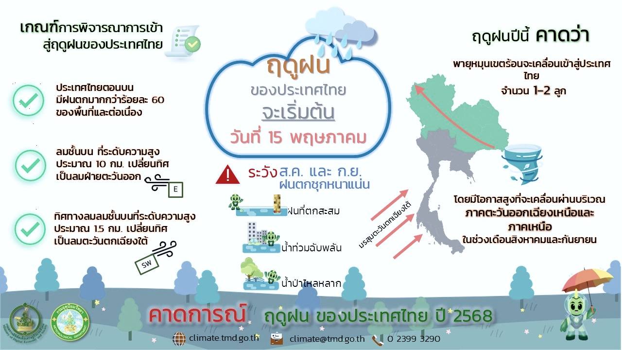 ประกาศเริ่มต้นเข้าสู่ฤดูฝนของประเทศไทยปี2568 ฤดูฝนของประเทศไทย จะเริ่มต้นวันที่ 15 พฤษภาคม 2568