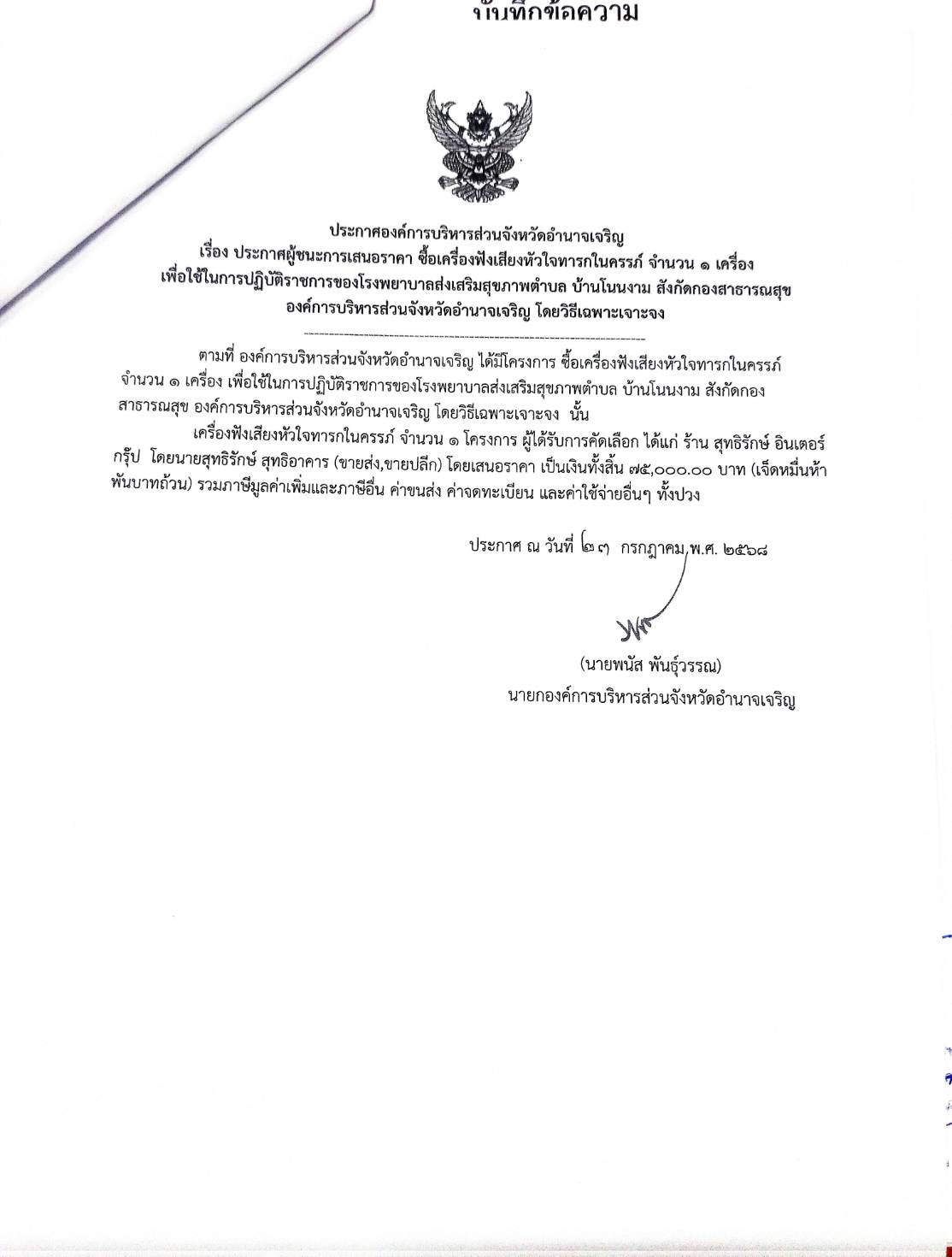 ประกาศผู้ชนะเสนอราคา ซื้อเครื่องฟังเสียงหัวใจทารกในครรภ์ จำนวน 1เครื่อง เพื่อใช้ในการปฏิบัติราชการของโรงพยาบาลส่งเสริมสุขภาพตำบล บ้านโนนงาม สังกัดกองสาธารณสุข องค์การบริหารส่วนจังหวัดอำนาจเจริญ โดยวิธีเฉพาะเจาะจง ประกาศ ณ วันที่ 23 กรกฎาคม 2568