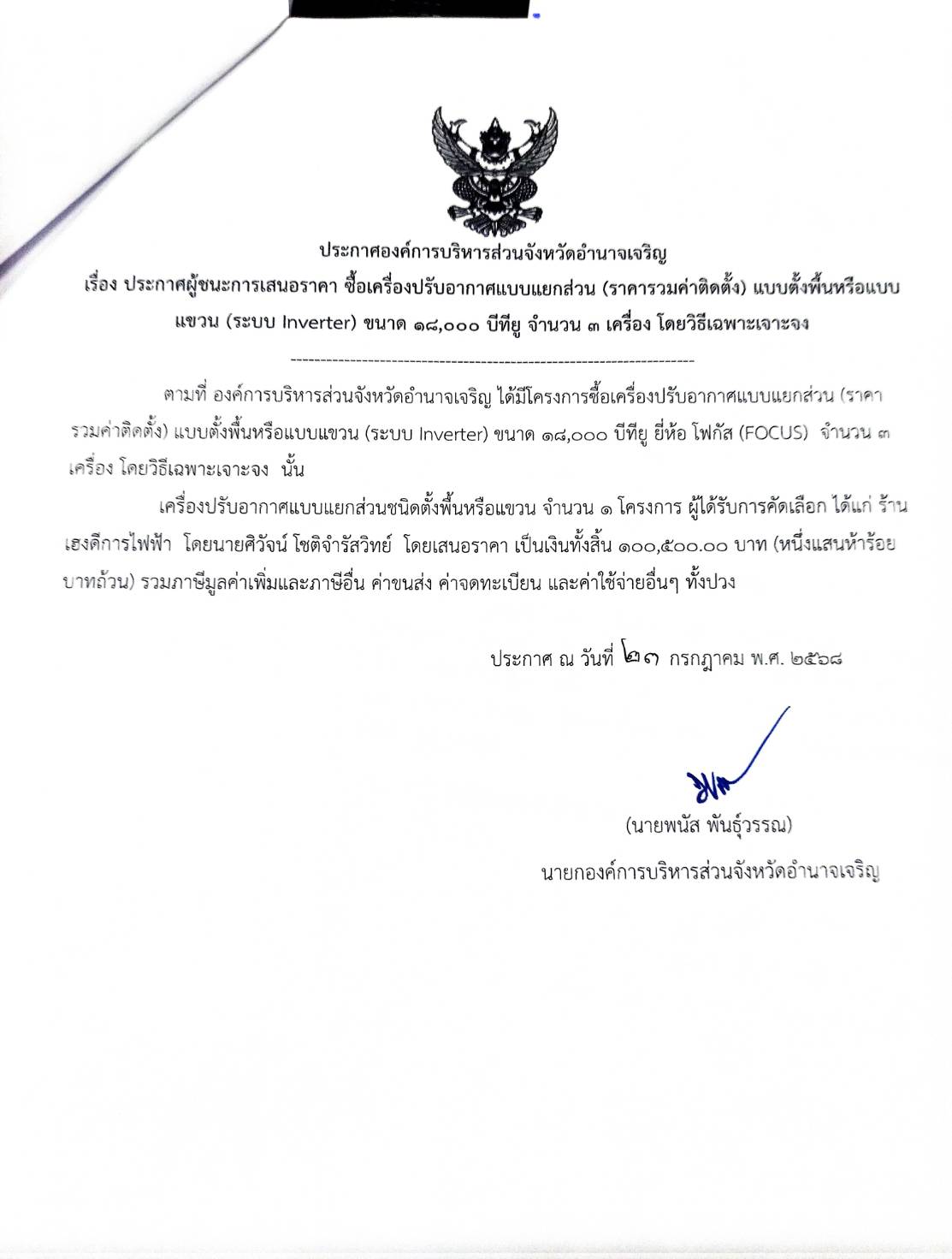 ประกาศผู้ชนะเสนอราคา ซื้อเครื่องปรับอากาศแบบแยกส่วน (ราคารวมค่าติดตั้ง) เบบตั้งพื้นหรือแบบแขวน (ระบบ inverter) ขนาด 18000 btu จำนวน 3เครื่องโดยวิธีเฉพาะเจาะจง ประกาศ ณ วันที่ 23 กรกฎาคม 2568