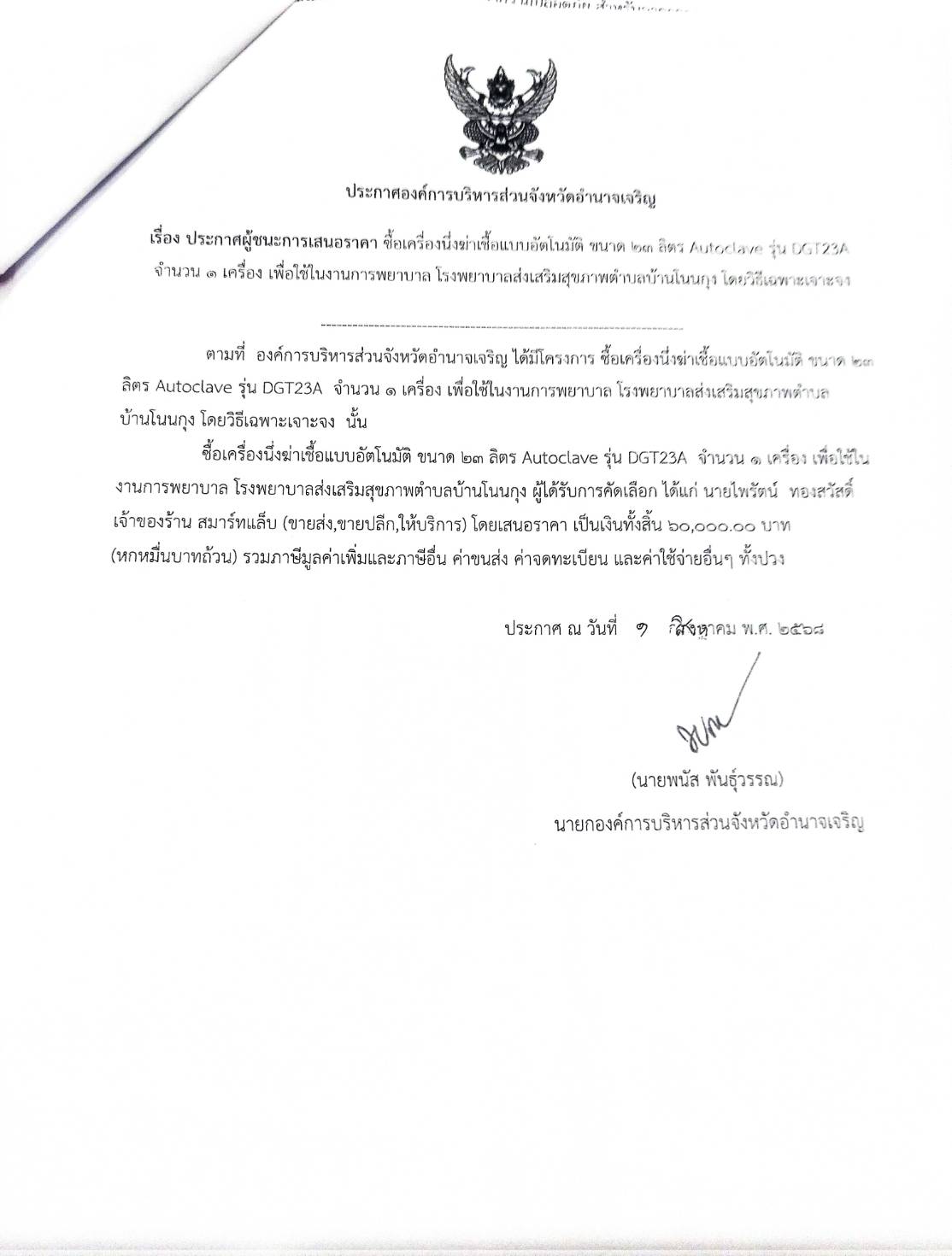 ประกาศผู้ชนะเสนอราคา ซื้อเครื่องนึ่งฆ่าเชื้อแบบอัตโนมัติ ขนาด 23 ลิตร Autoria ve รุ่น DGT23A จำนวน 1 เครื่อง เพื่อใช้ในงานการพยาบาล โรงพยาบาลส่งเสริมสุขภาพตำบลบ้านโนนกุง โดยวิธีเฉพาะเจาะจง ประกาศ ณ วันที่ 1 สิงหาคม 2568