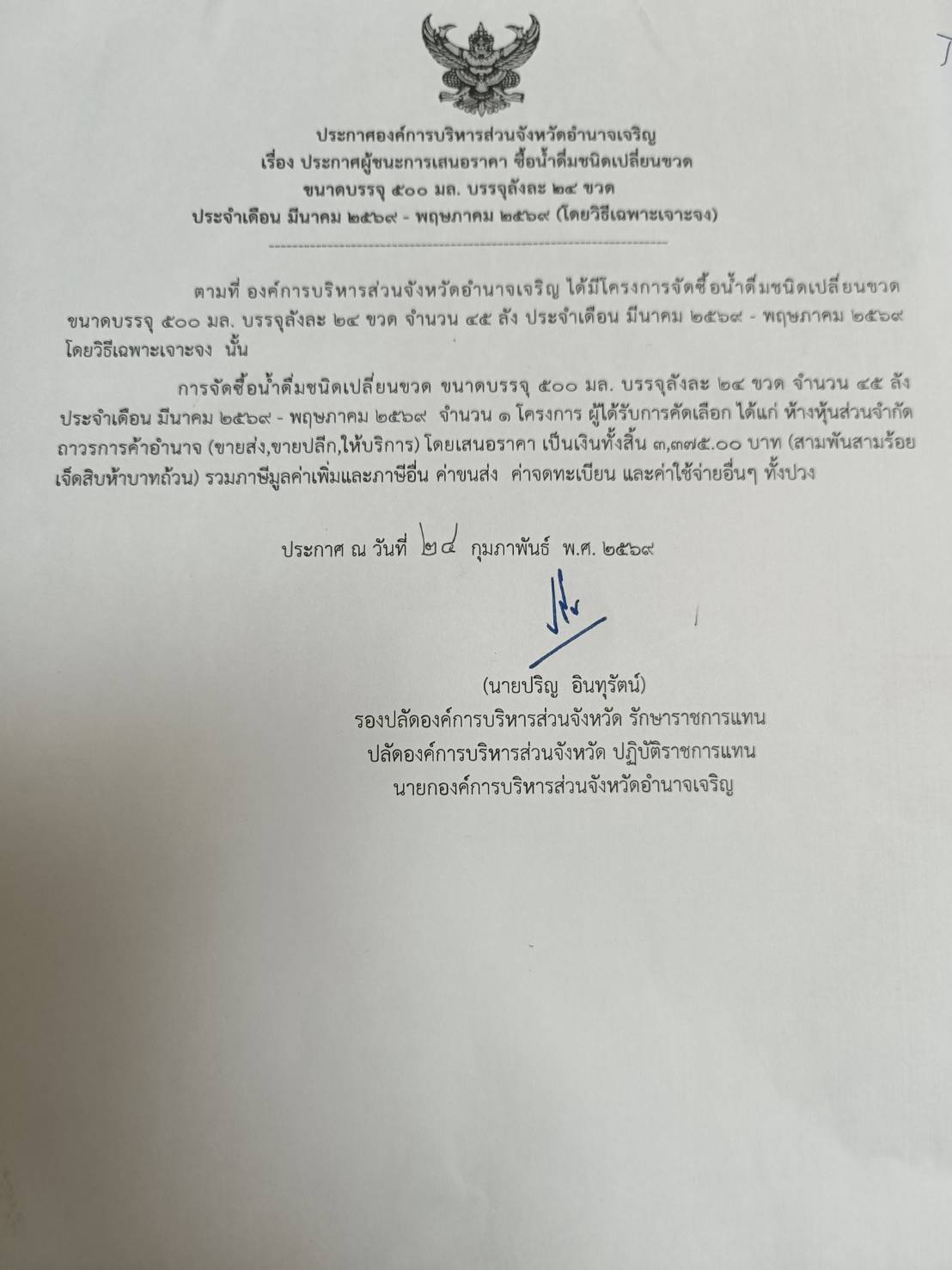 ประกาศผู้ชนะการเสนอราคาการจัดซื้อน้ำดื่ม ประจำเดือน มีนาคม 2569 - พฤษภาคม 2569 โดยวิธีเฉพาะเจาะจง ประกาศ ณ วันที่ 20 กุมภาพันธ์ 2569