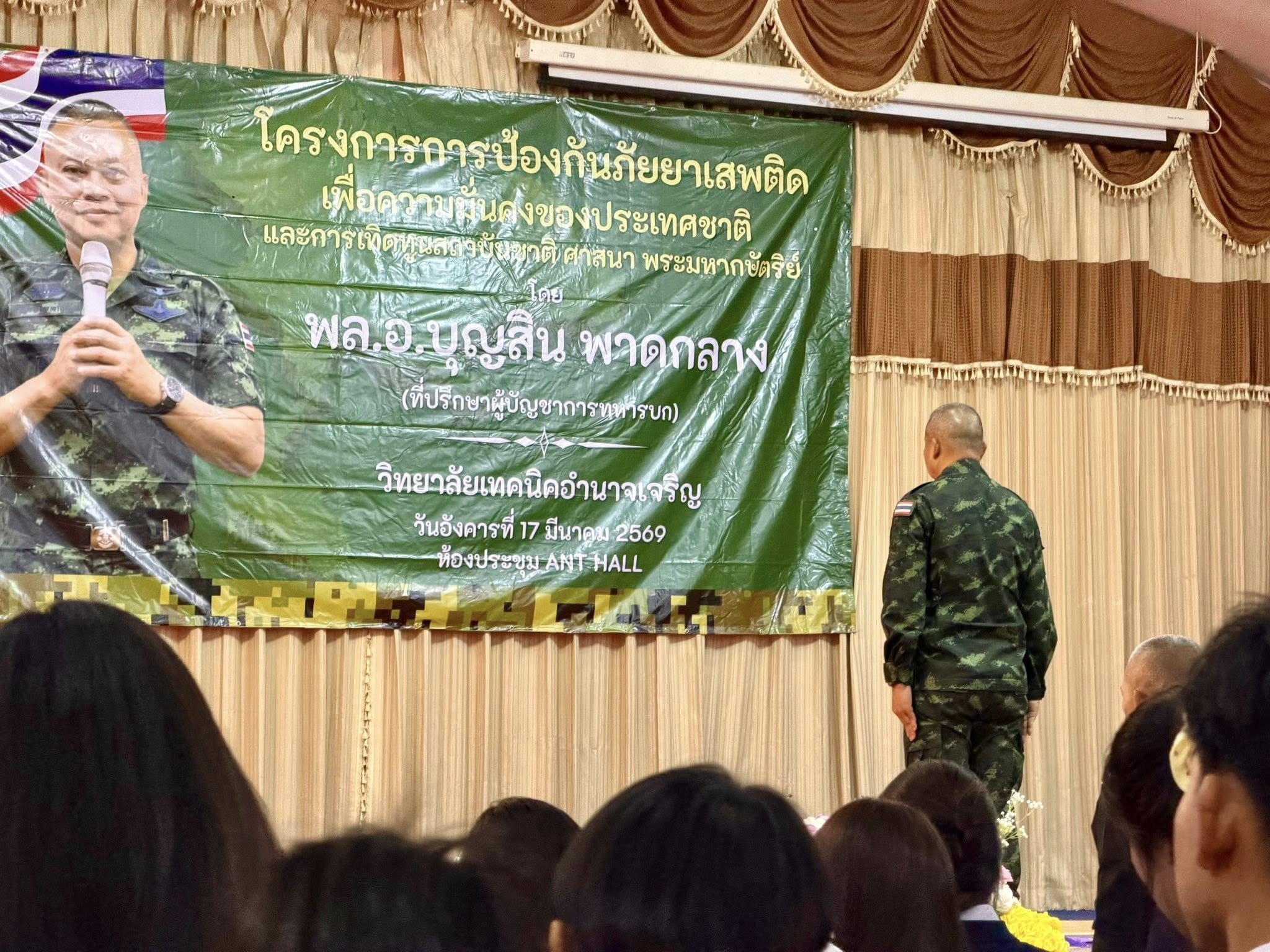 วันที่ 17 มีนาคม 2569 เวลา 10.00 น. ณ ห้องประชุม ANT HALL วิทยาลัยเทคนิคอำนาจเจริญ พล.อ.บุญสิน พาดกลาง ที่ปรึกษาผู้บัญชาการทหารยก เป็นประธานเปิดโครงการป้องกันภัยยาเสพติด เพื่อความมั่นคงของประเทศชาติและการเทิดทูนสถาบันชาติ ศาสนา พระมหากษัตริย์ ประจำปี 2569