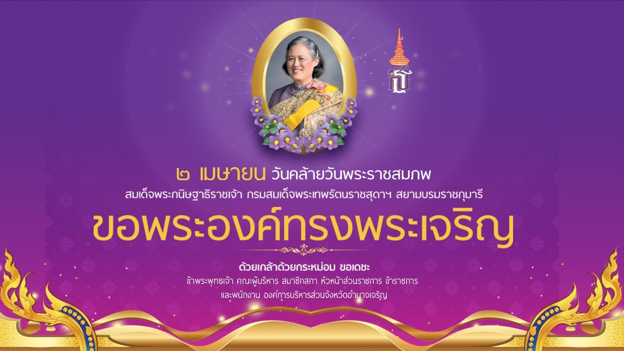 2 เมษายน วันคล้ายวันพระราชสมภพ สมเด็จพระกนิษฐาธิราชเจ้า กรมสมเด็จพระเทพรัตนราชสุดาฯ สยามบรมราชกุมารี ขอพระองค์ทรงพระเจริญ ด้วยเกล้าด้วยกระหม่อม ขอเดชะ ข้าพระพุทธเจ้า คณะผู้บริหาร สมาชิกสภาฯ ข้าราชการ พนักงาน และเจ้าหน้าที่ องค์การบริหารส่วนจังหวัดอำนาจเจริญ