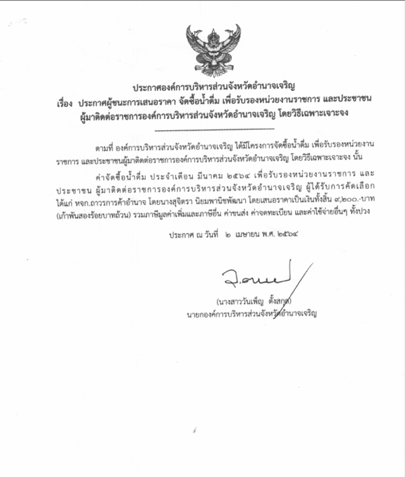 ประกาศผู้ชนะการเสนอราคา จัดซื้อน้ำ เพื่อรองรับหน่วยงานราชการและประชาชนผู้มาติดต่อราชการ อบจ.อจ โดยวิธีเฉพาะเจาะจง ประกาศ ณ วันที่ 2 เม.ย. 64